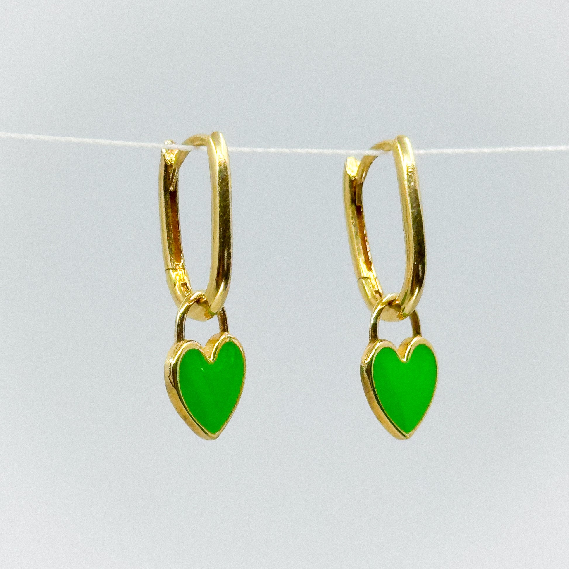Los aretes Amor Esmeralda están elaborados en oro sólido de 18 quilates y destacan por su diseño versátil: una argolla fina y elegante que sostiene un dije de corazón verde —símbolo de armonía y esperanza— que puede retirarse en cualquier momento, permitiendo lucirlos de dos maneras.