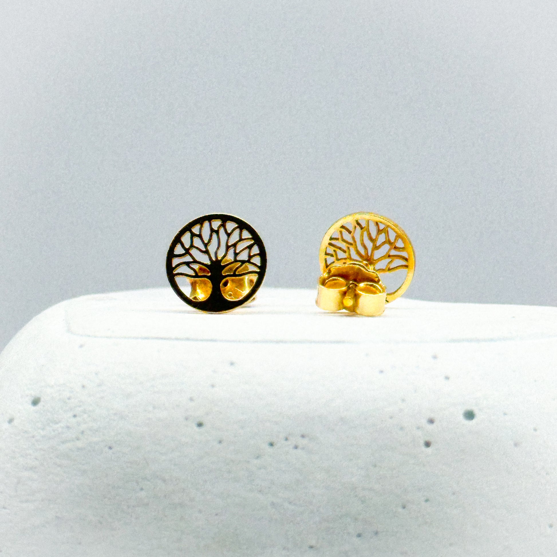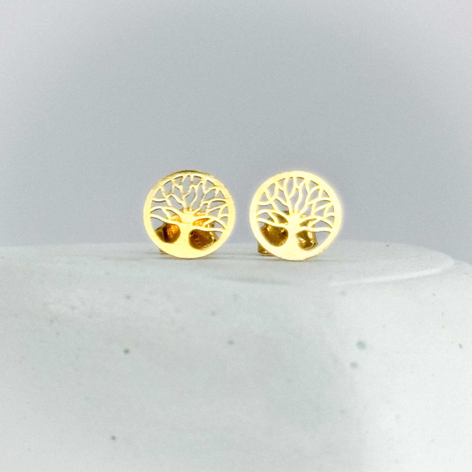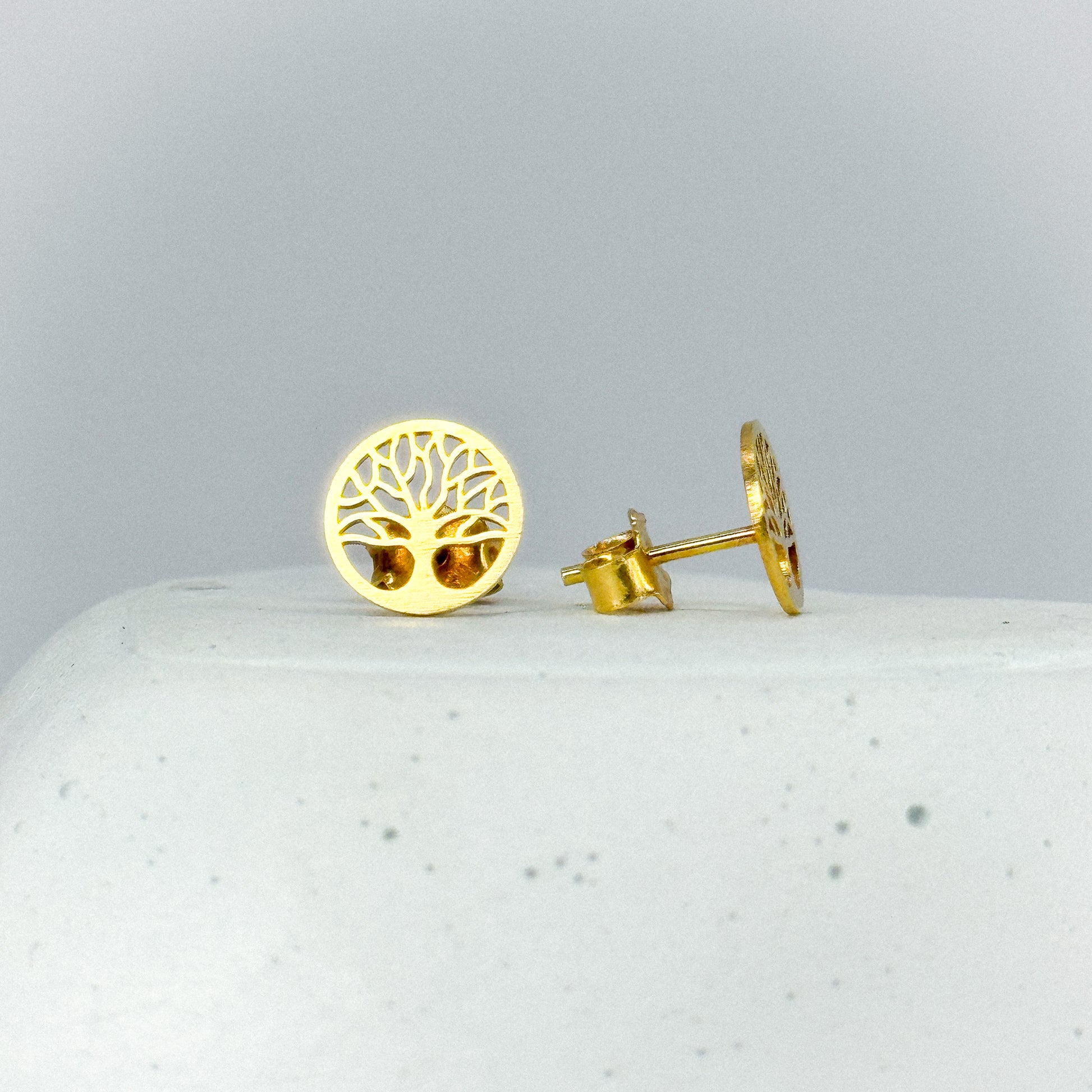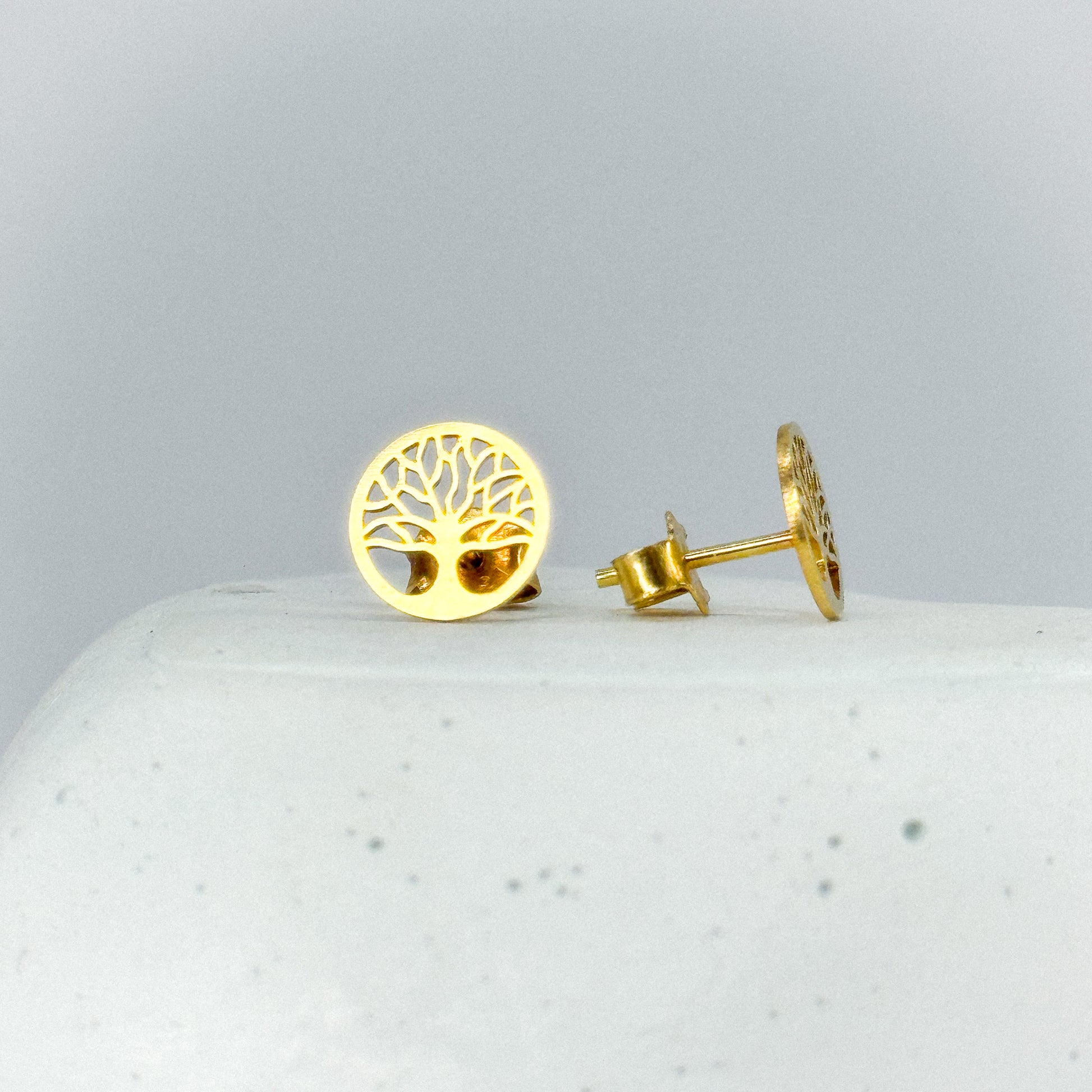 Elegantes aretes de oro 18k con el símbolo del árbol de la vida, representando fuerza, crecimiento y conexión. Un diseño armonioso y lleno de significado, ideal para quienes buscan una joya con energía positiva y estilo atemporal.