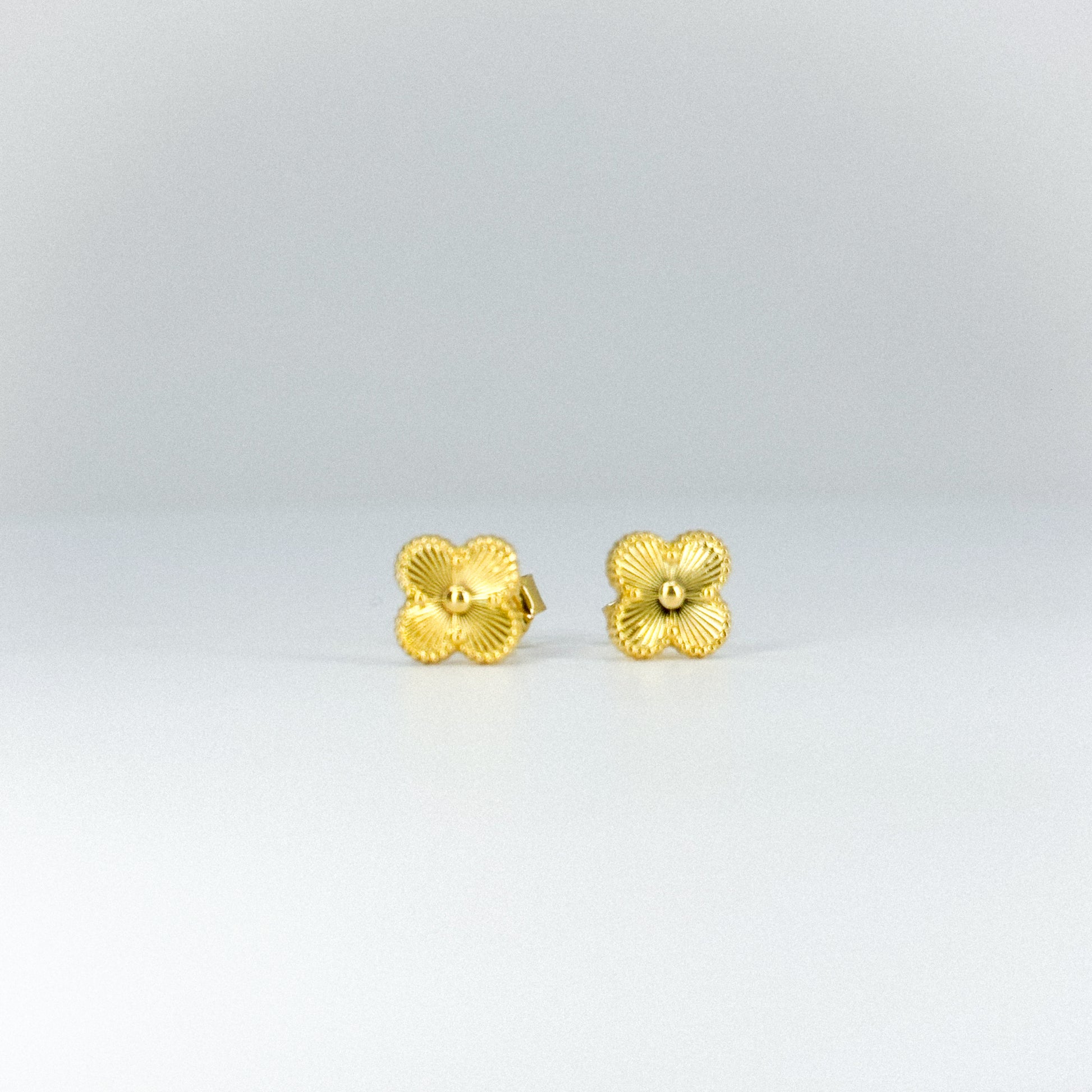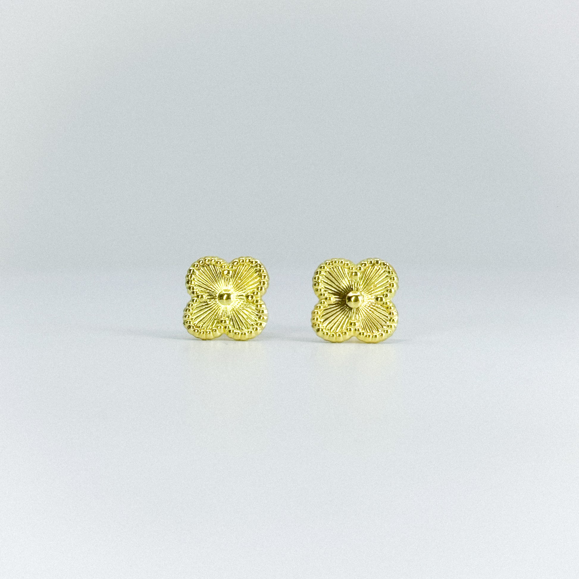 Aretes de trébol dorado en oro 18k, símbolo de buena fortuna y elegancia. Su diseño clásico con acabado brillante aporta un toque delicado y sofisticado, perfectos para realzar cualquier look con sutileza y estilo.