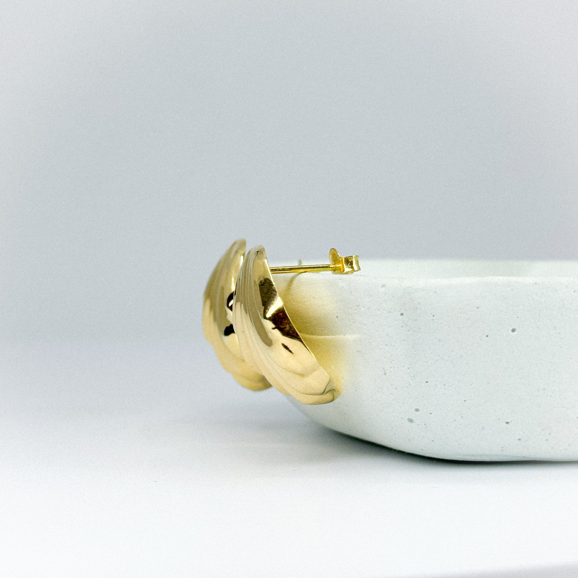 Elegantes aretes en forma de concha marina, elaborados en oro 18k con acabado espejo que refleja la luz con un brillo exquisito. Una pieza atemporal que irradia lujo y sofisticación.