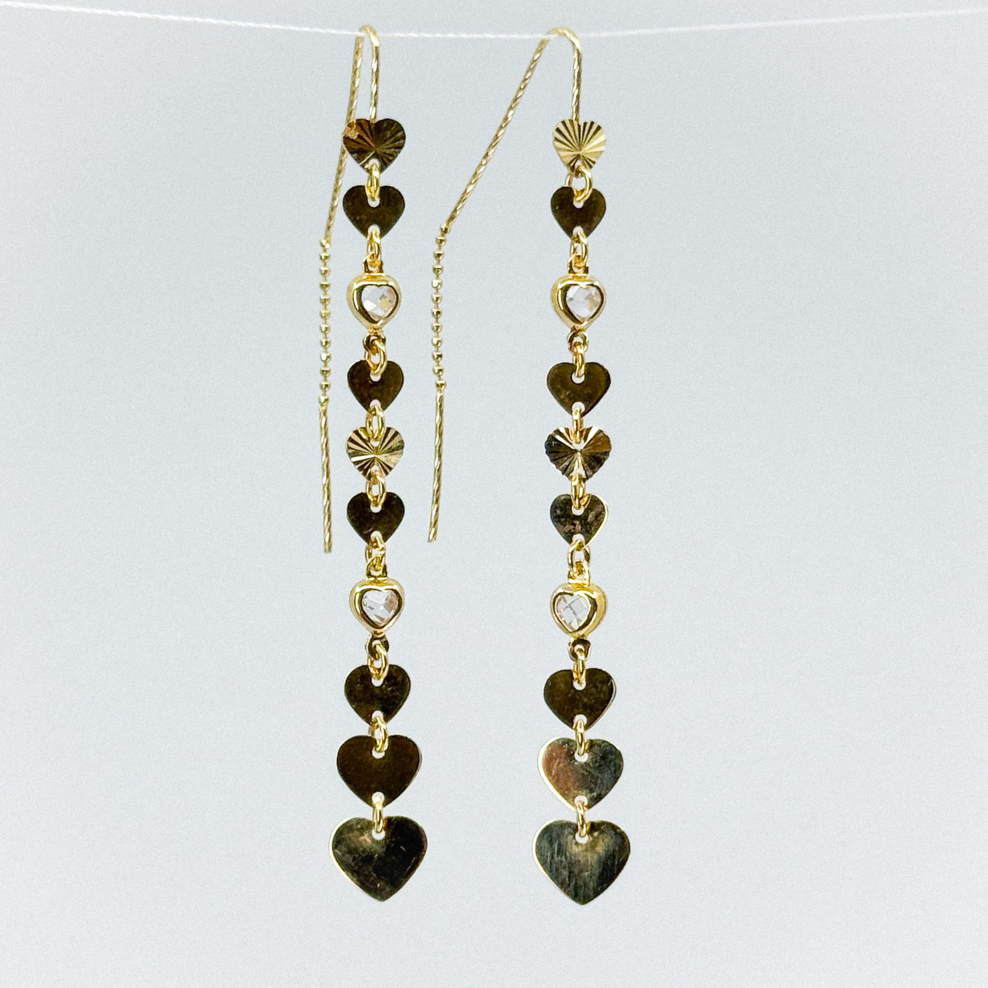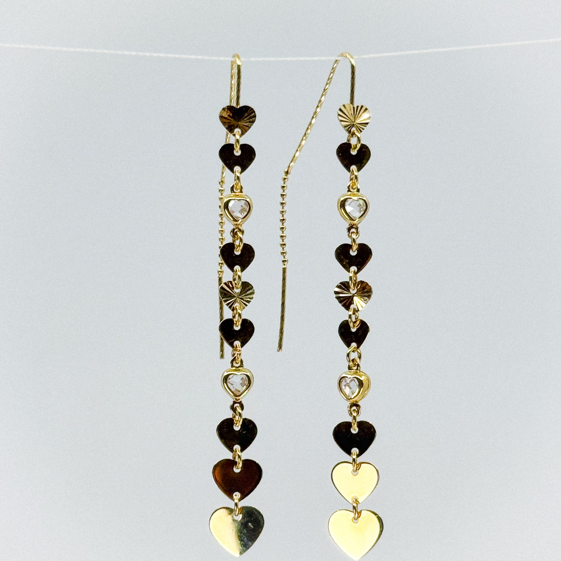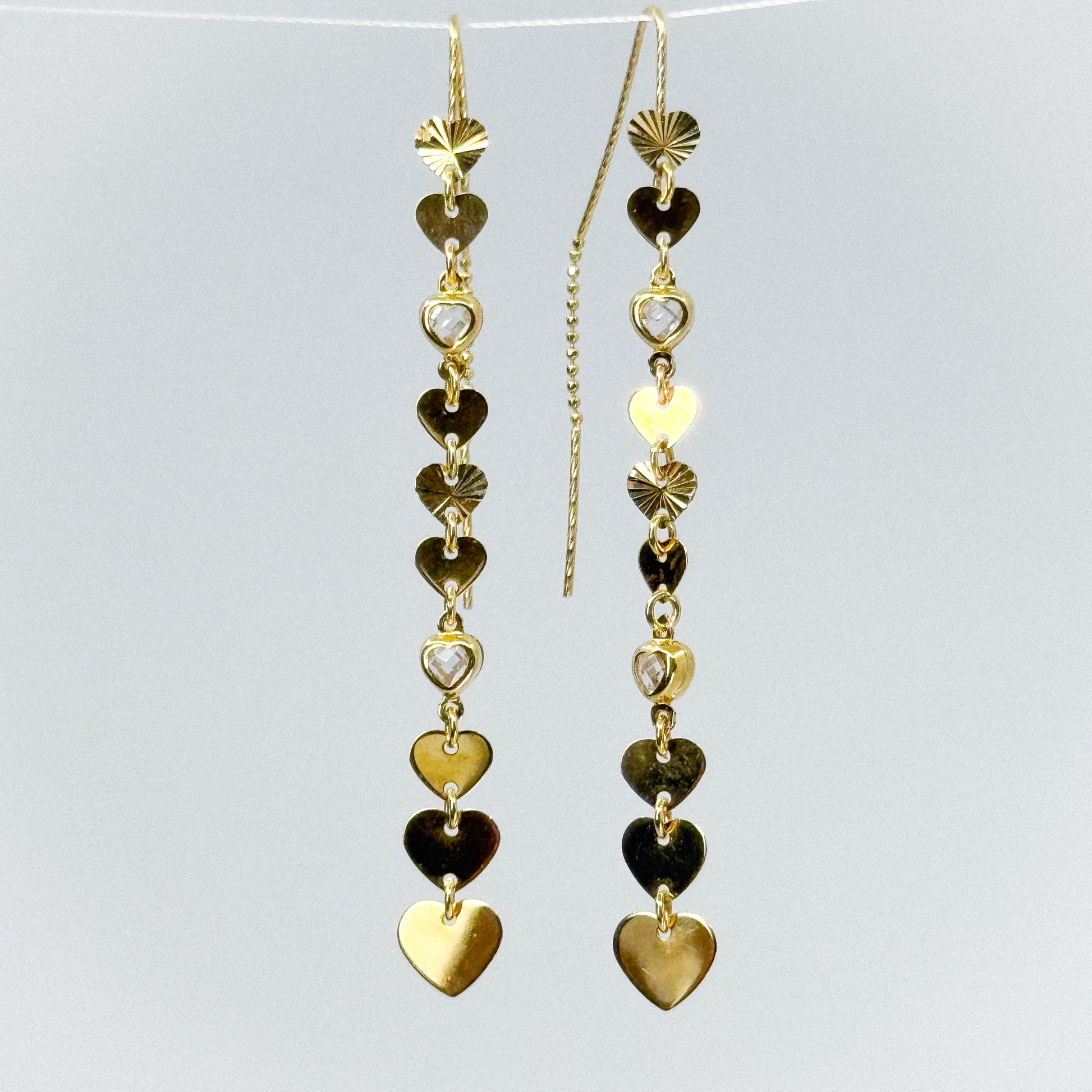 Los aretes Lluvia de Corazones están elaborados en oro sólido de 18 quilates y destacan por su diseño colgante con varias placas en forma de corazón dispuestas en una hilera vertical, creando un efecto de caída delicado y encantador.