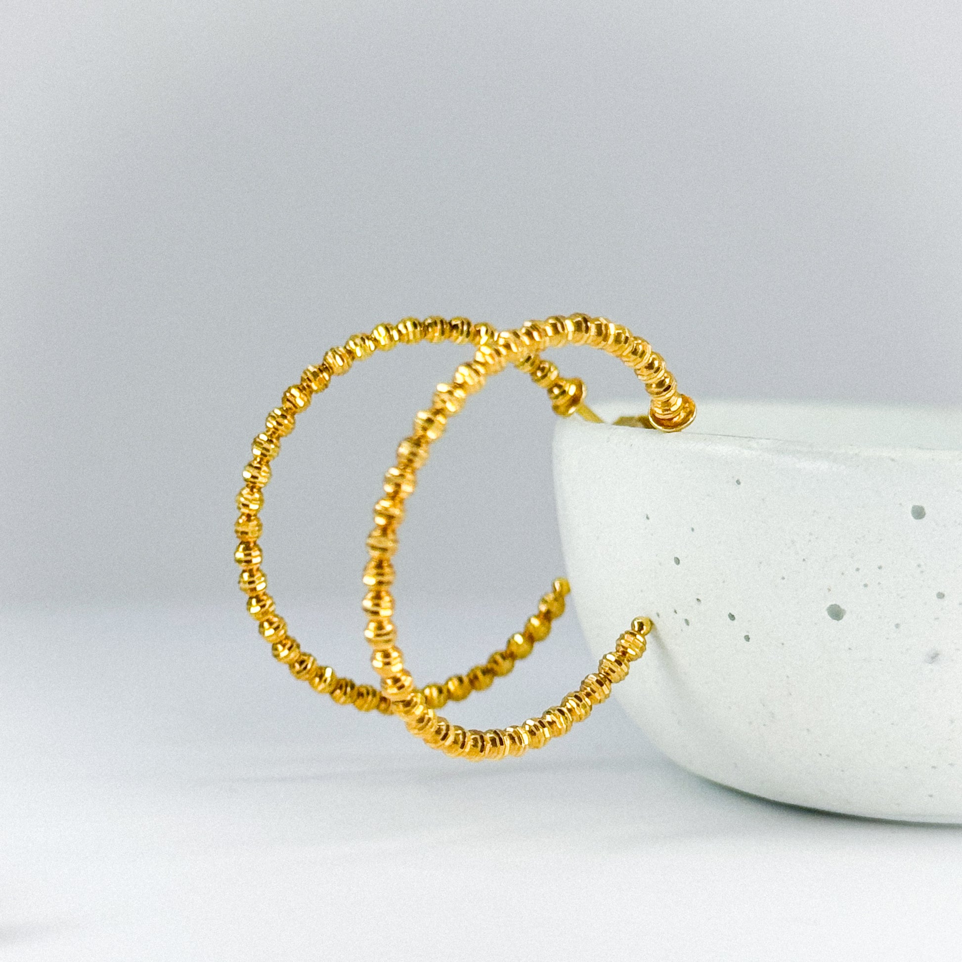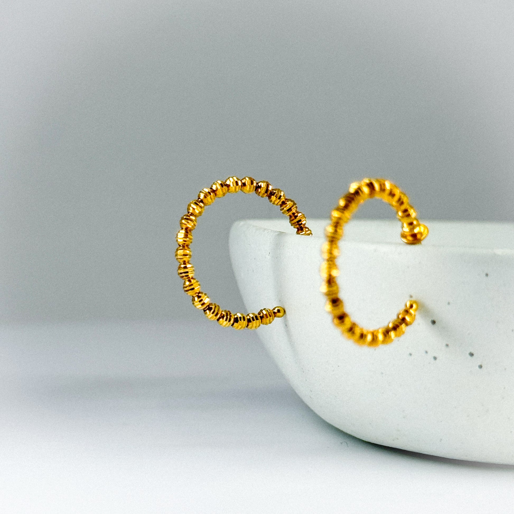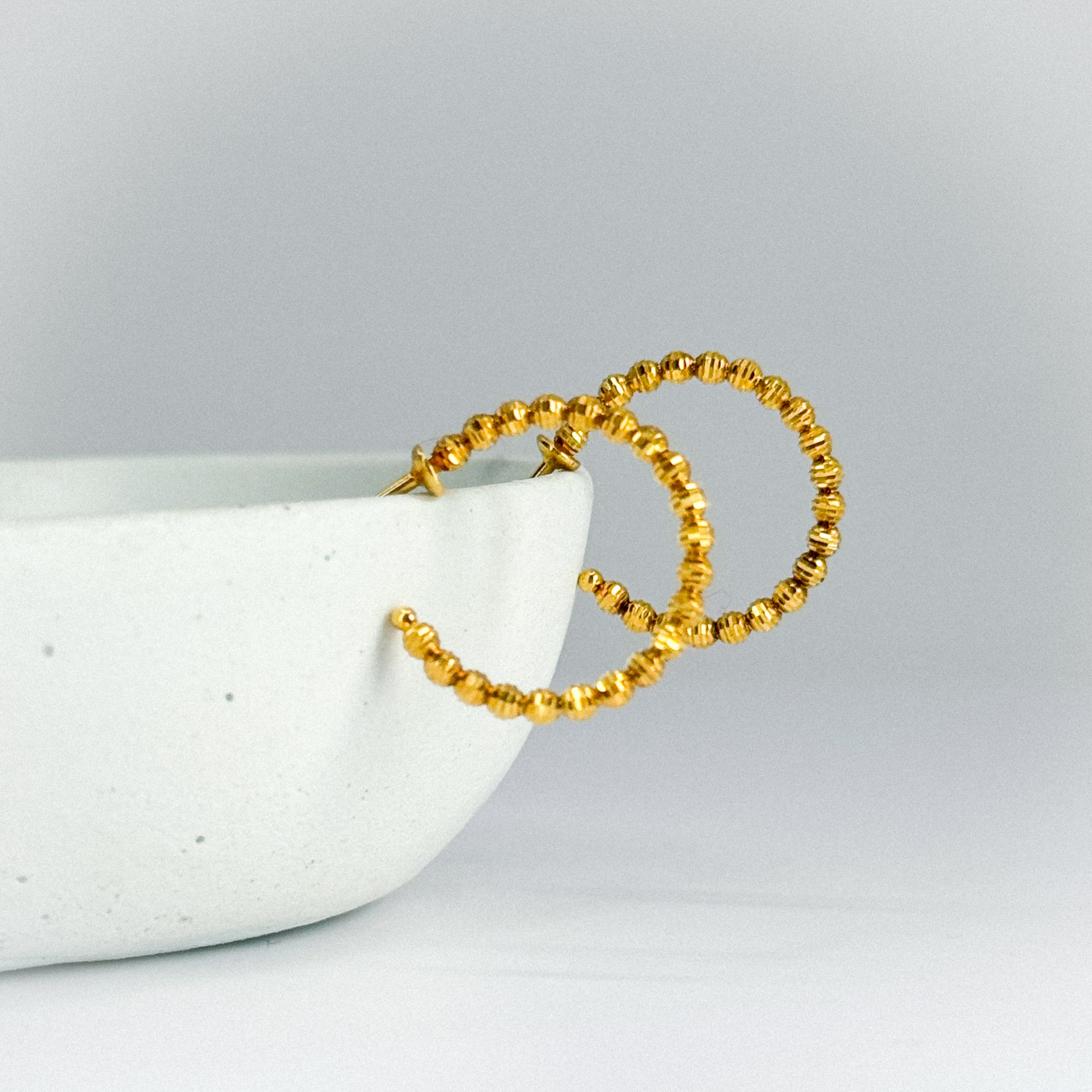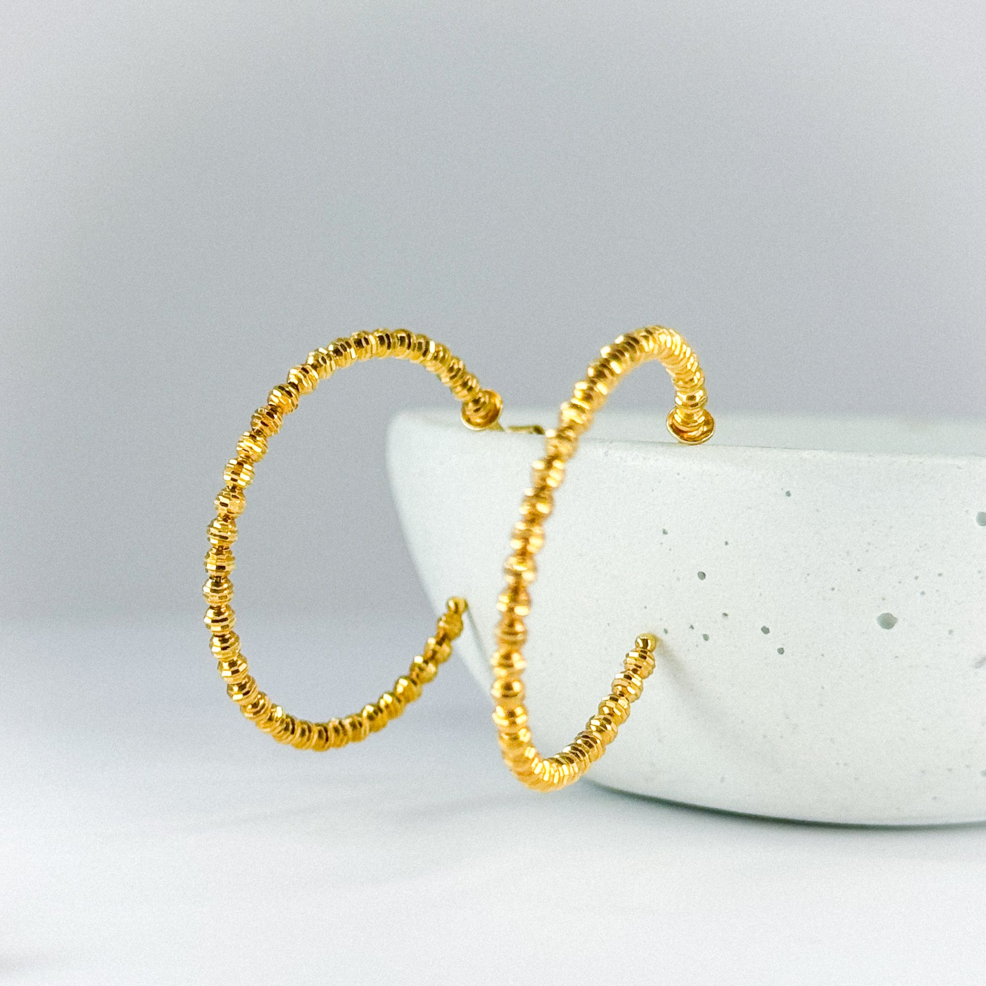 Los aretes Chakira Dorada destacan por su diseño lleno de brillo y textura. Cada argolla está compuesta por delicadas bolitas en forma de chakira que reflejan la luz con cada movimiento, creando un efecto luminoso y elegante.