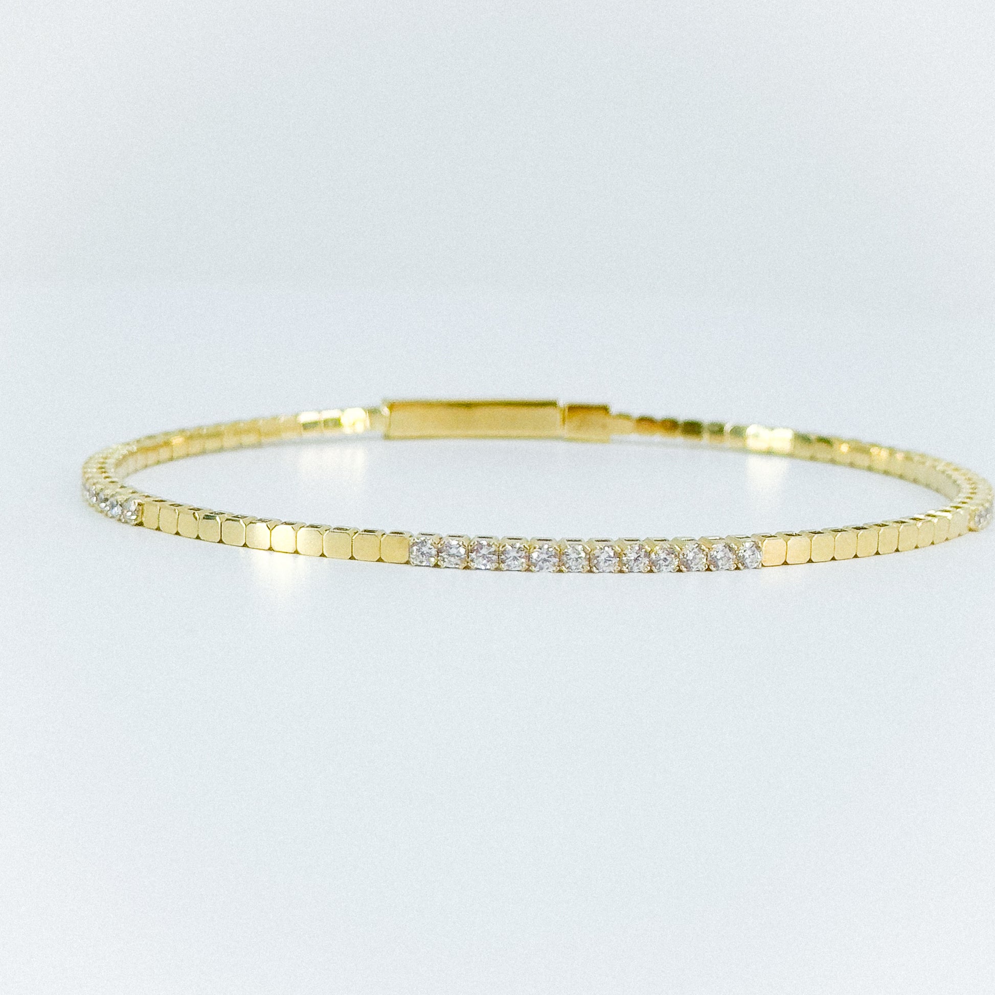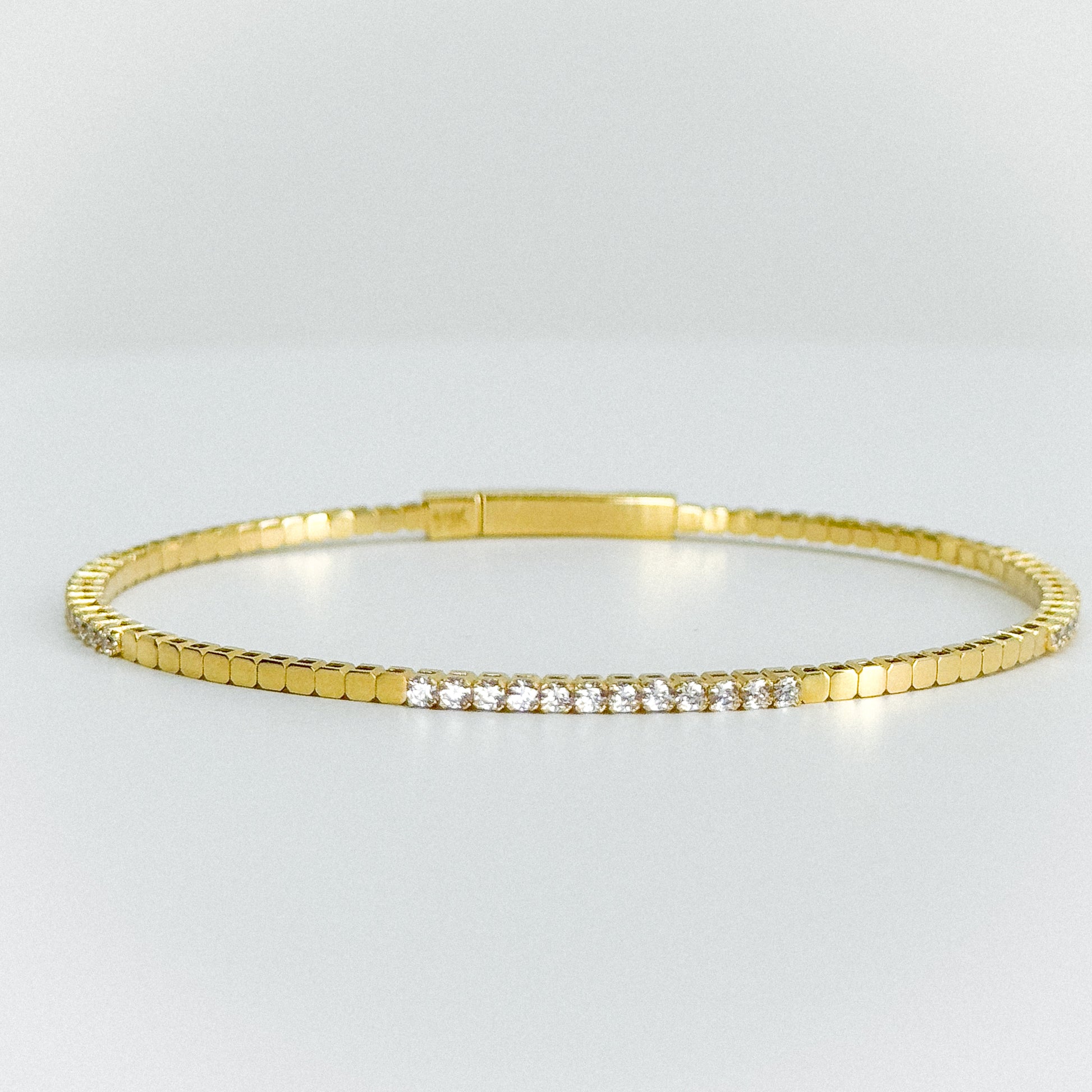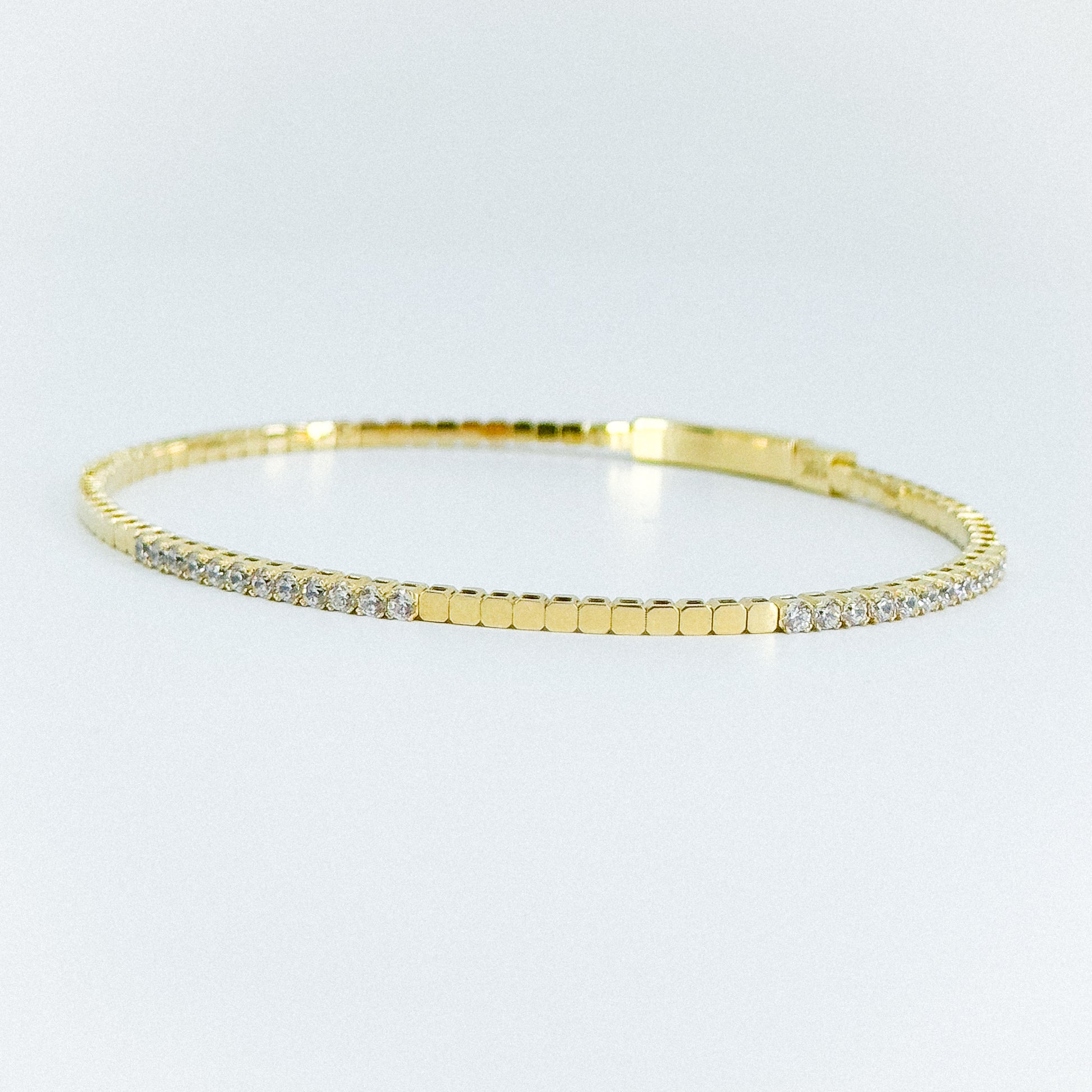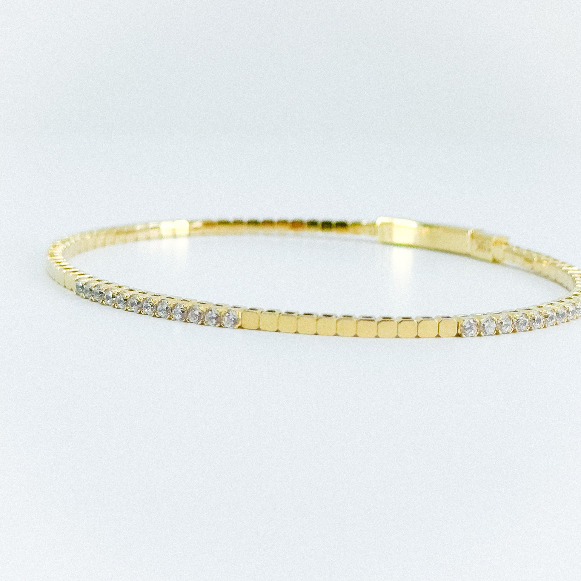 Una joya que combina elegancia y sofisticación. Elaborada en oro amarillo de 18 quilates, esta pulsera tipo rígida presenta un diseño minimalista realzado por una delicada línea de zirconias brillantes que capturan la luz con cada movimiento. Perfecta para llevar en ocasiones especiales o para añadir un toque de lujo a tu día a día.