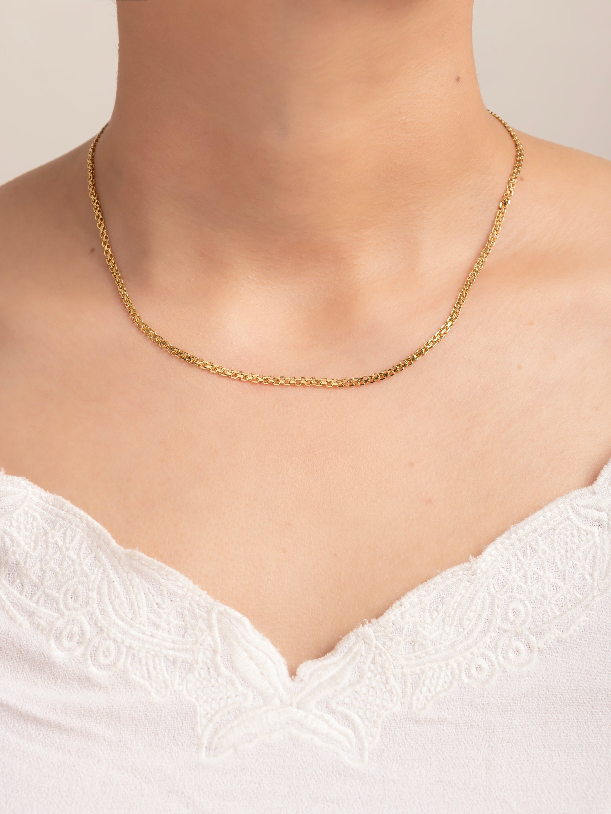 Elaborada en oro de 18 quilates, destaca por su durabilidad, firmeza y estilo atemporal. Es una cadena ideal para lucir sola como protagonista o combinar con dijes que realcen su diseño refinado.