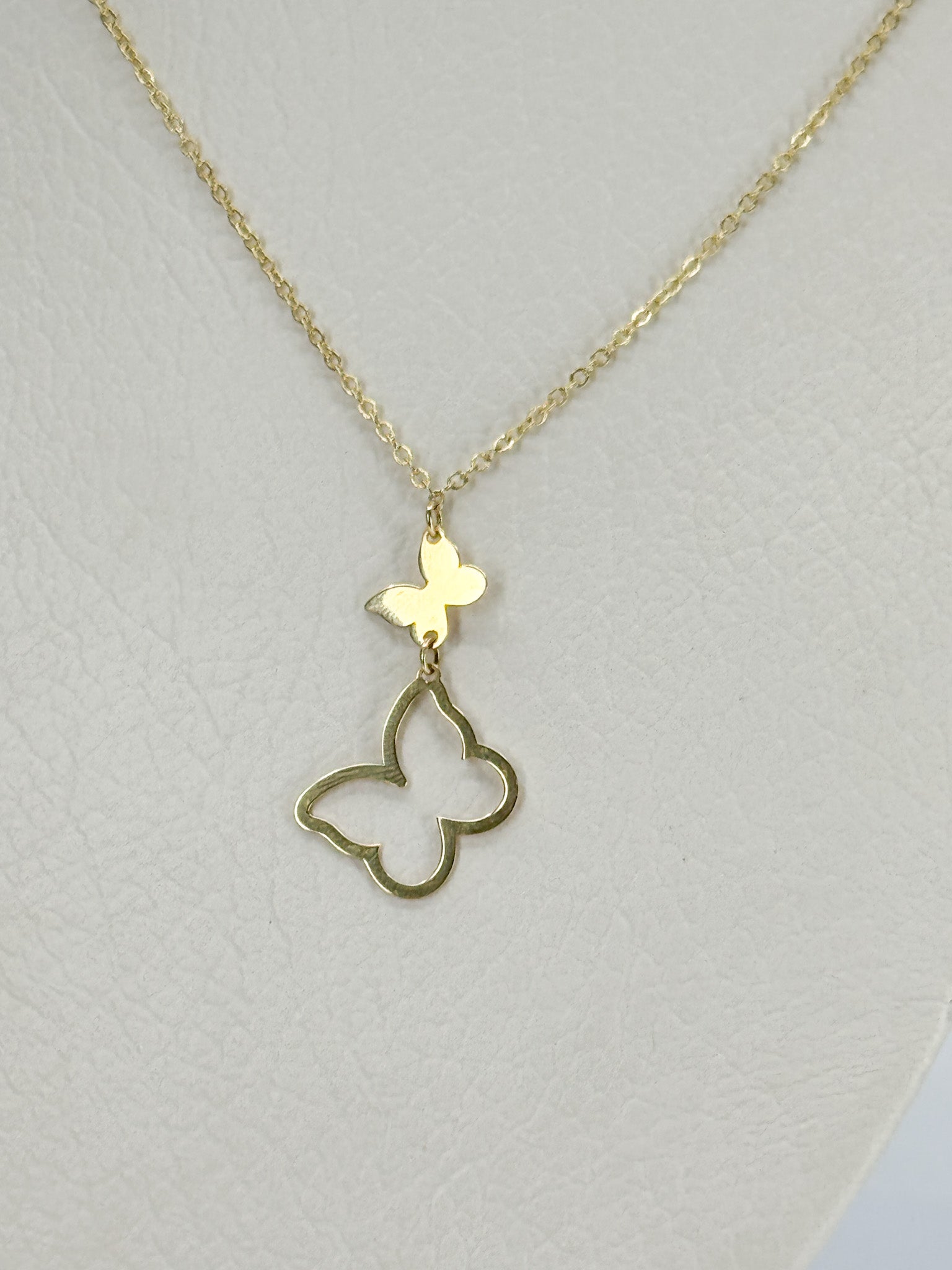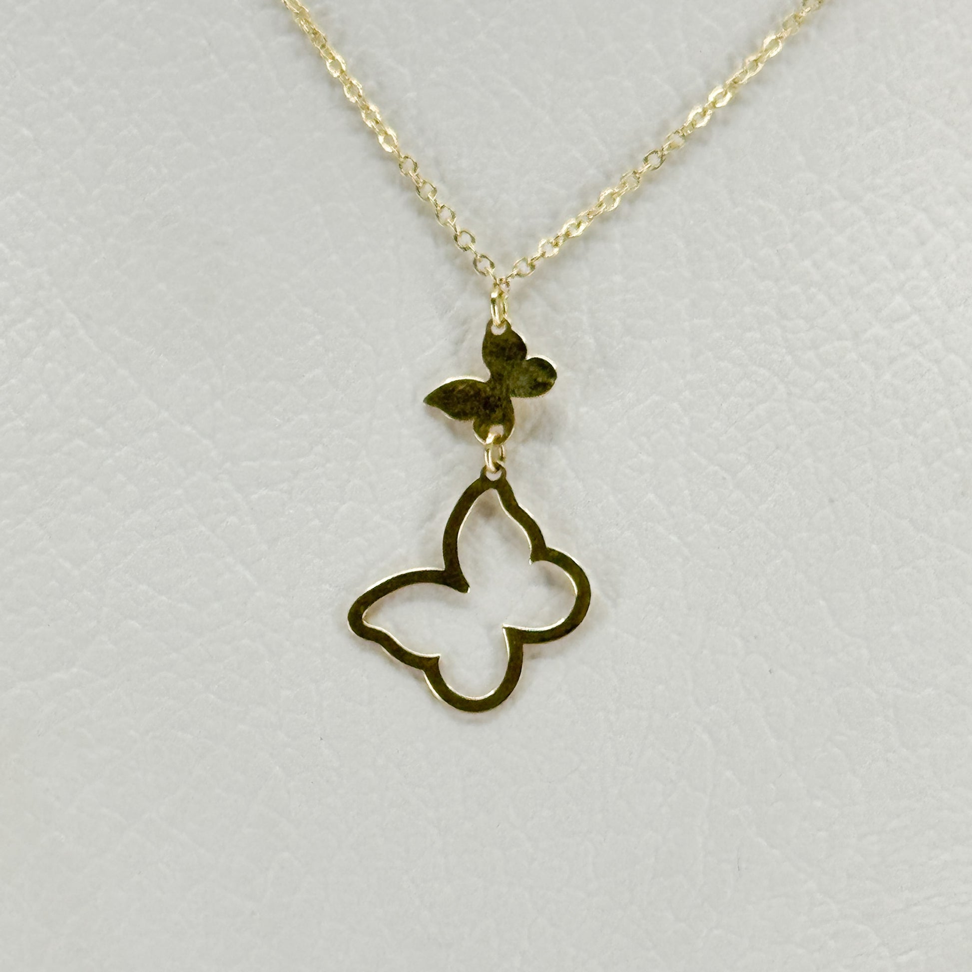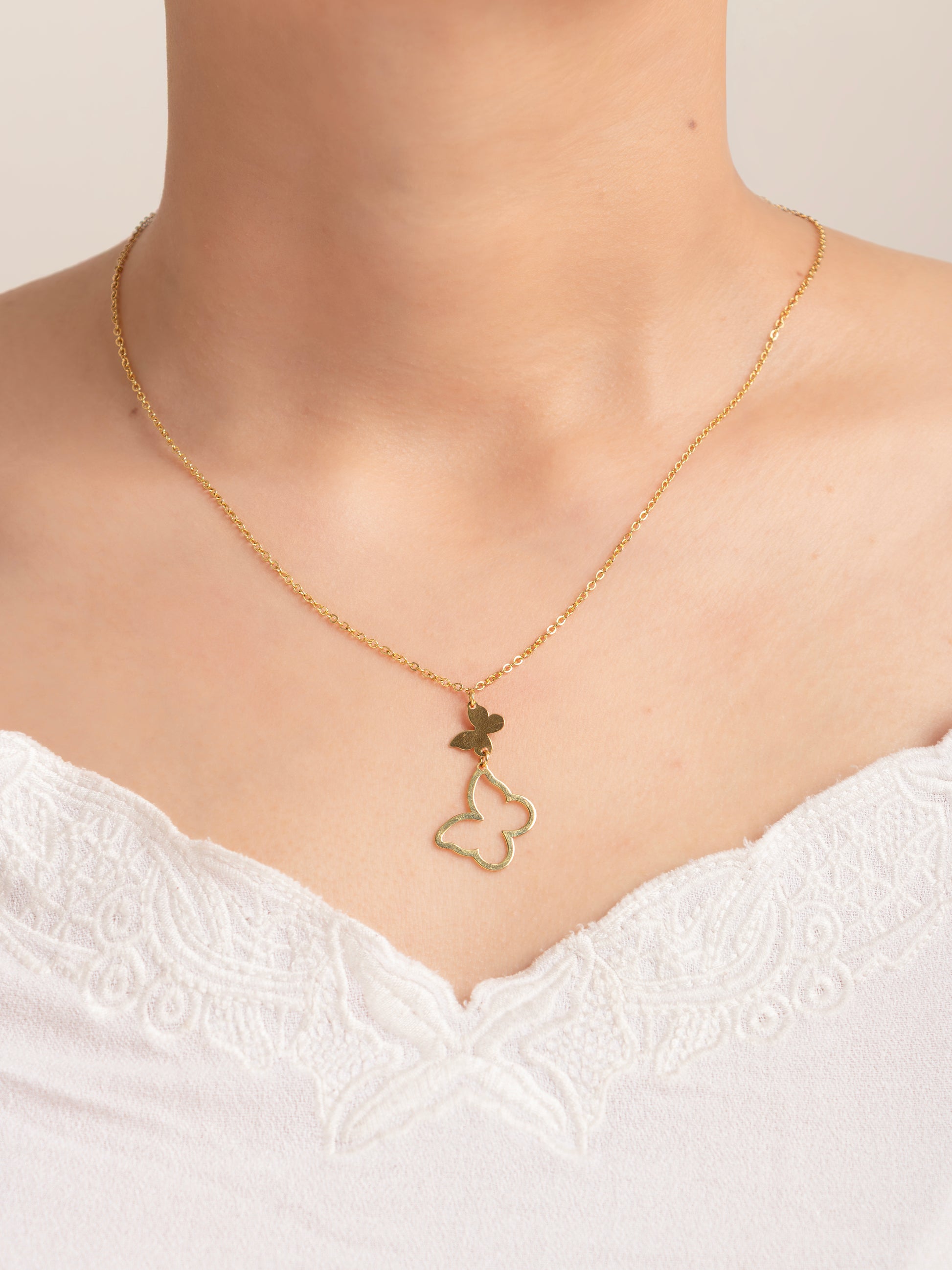 Un collar delicado y femenino que destaca por su diseño de doble mariposa. La pieza superior es una pequeña mariposa sólida, mientras que la inferior presenta una mariposa calada de contornos suaves y elegantes. Ambas están elaboradas en un acabado dorado brillante que aporta luz y movimiento a cada paso.
