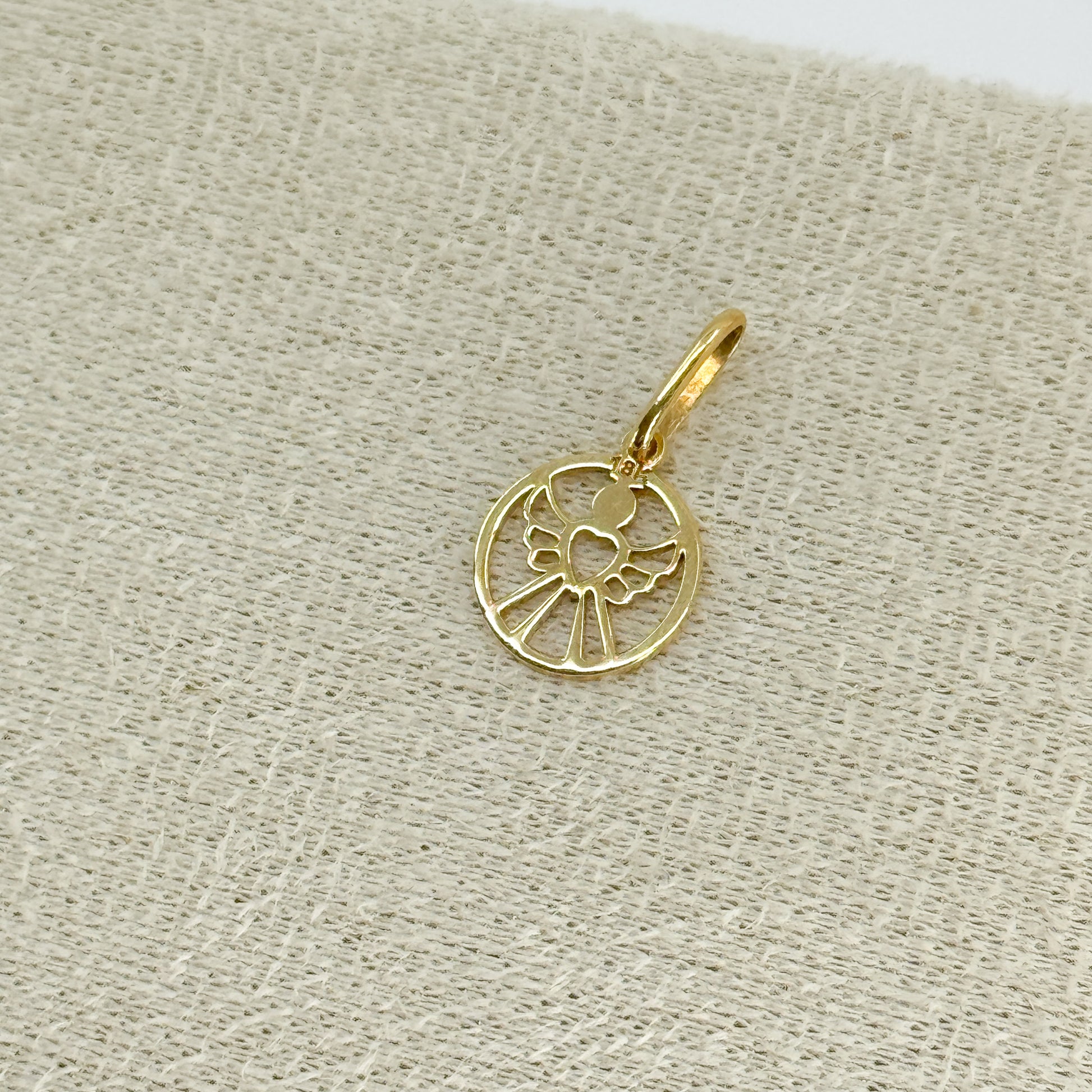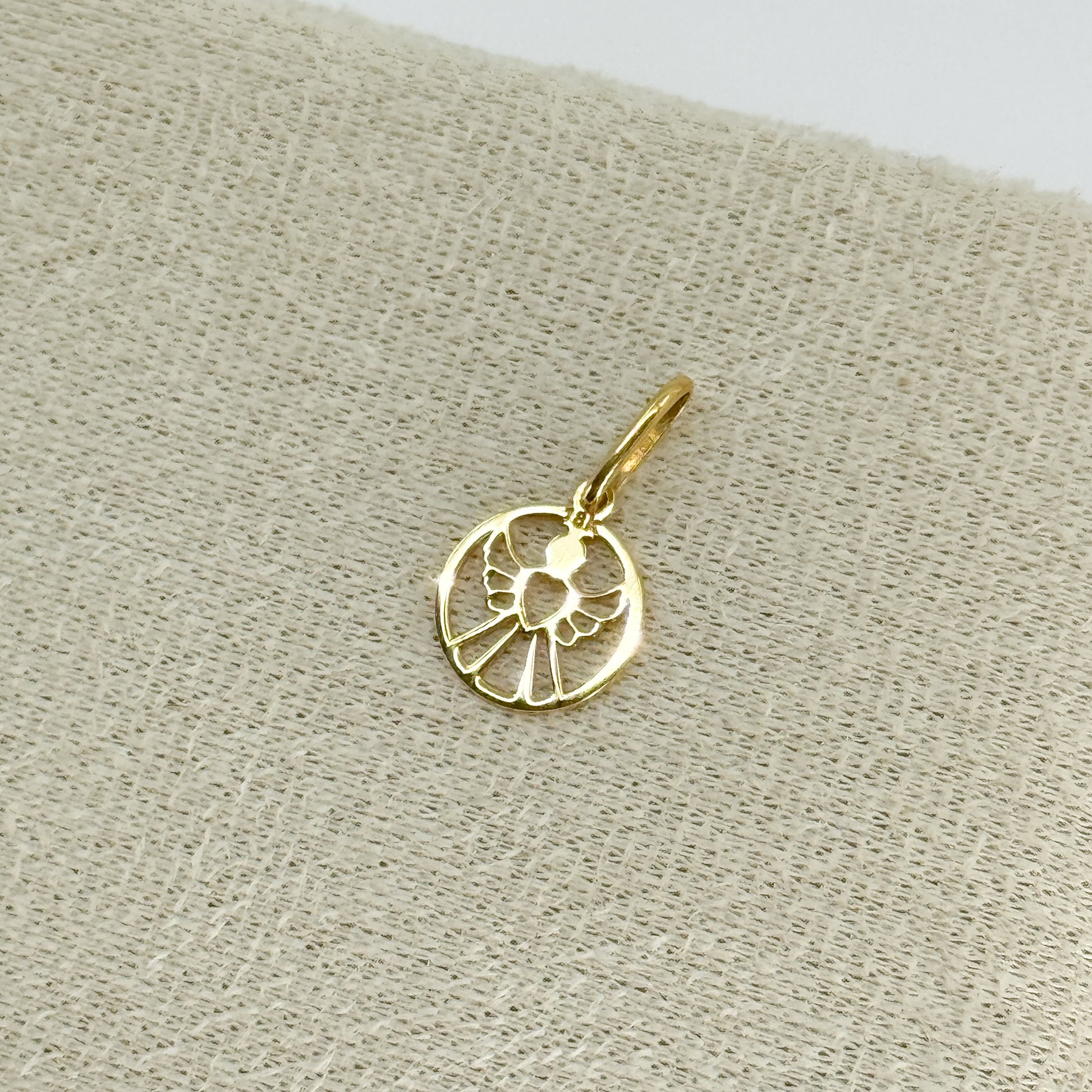 Delicado y lleno de significado, nuestro Dije Ángel de Corazón en oro 18k presenta un diseño calado dentro de una medalla circular, destacando un ángel con un corazón al centro. Su silueta fina y armoniosa simboliza protección, amor y guía espiritual.