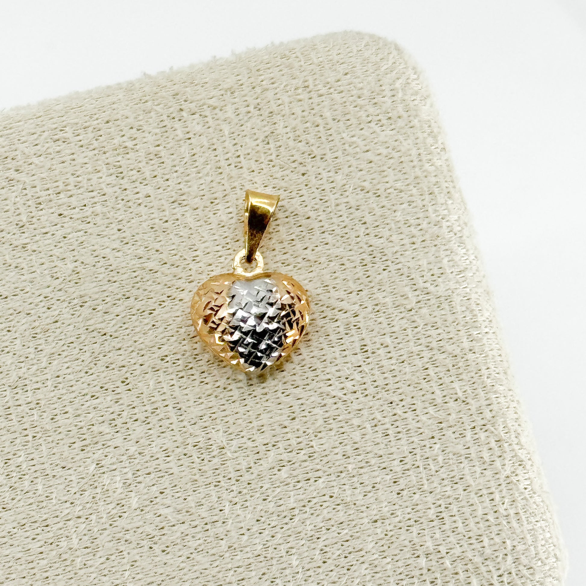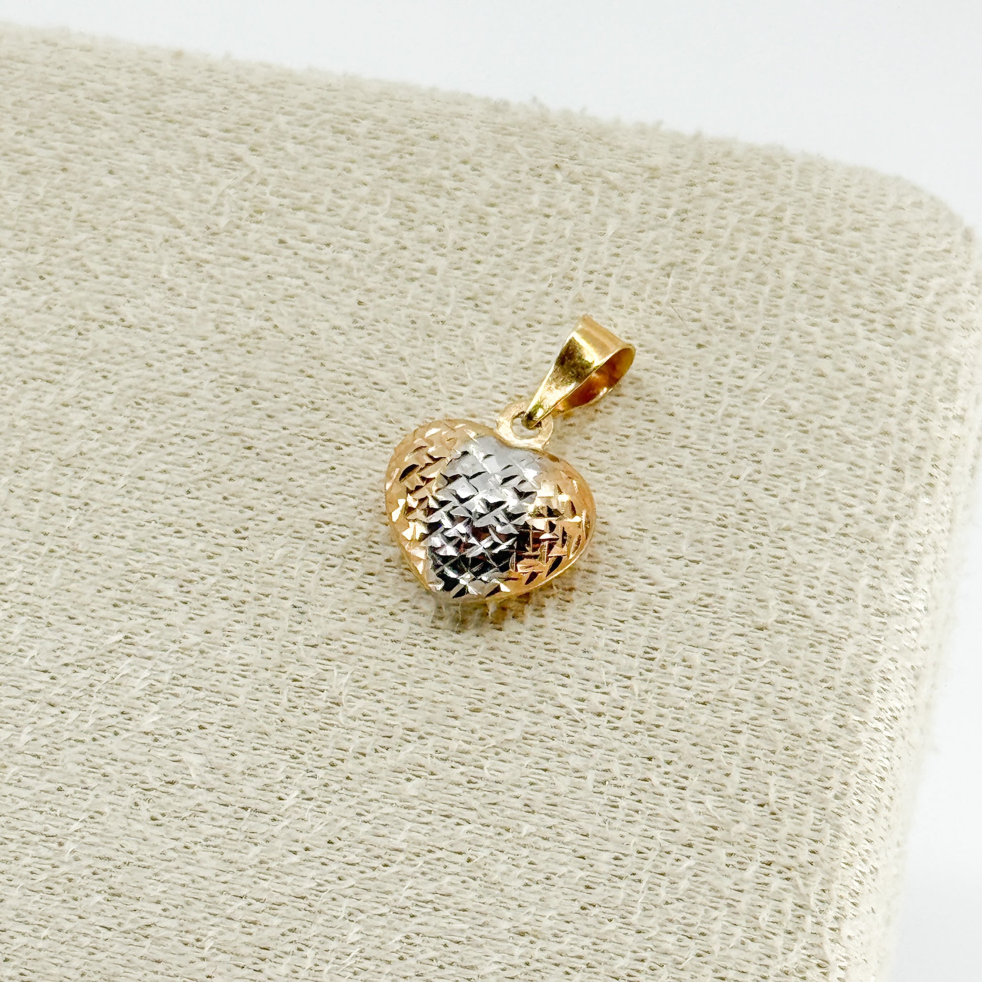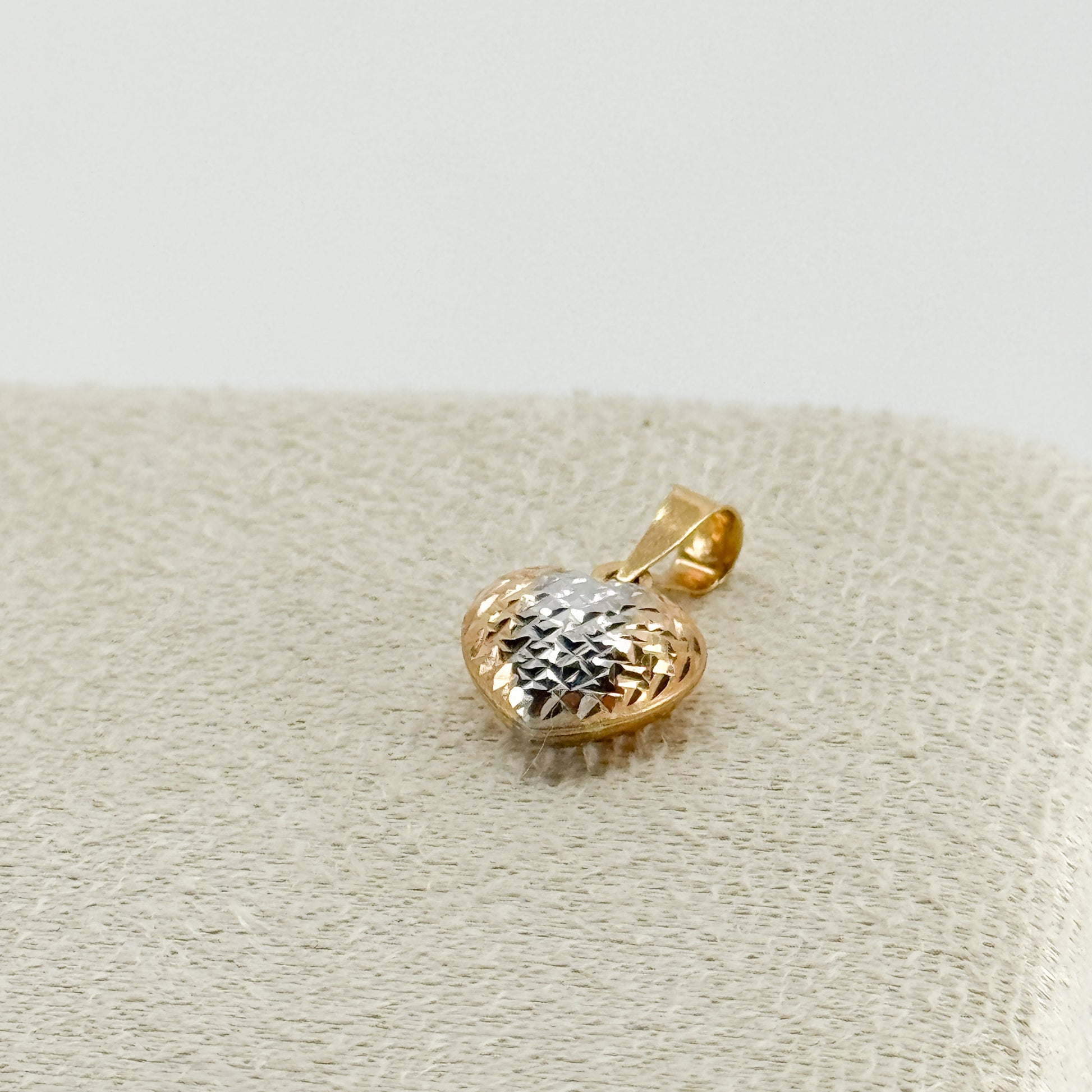 El Dije Corazón Tricolor Bombé es una pieza sofisticada y única, diseñada con un acabado bombeado que aporta volumen, brillo y una apariencia suave y elegante. Su corazón está dividido en tres franjas perfectamente definidas, elaboradas en oro amarillo, blanco y rosa, creando un contraste armonioso que simboliza la unión y la diversidad del amor.