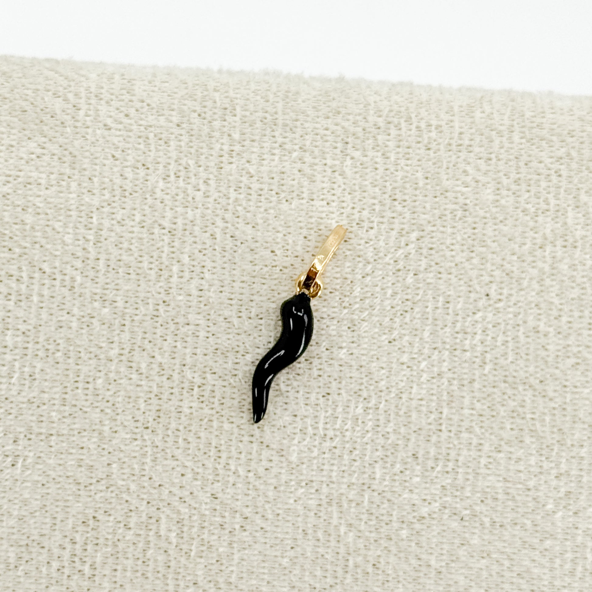 El dije Cornicello Noir combina la fuerza del color negro con la elegancia del oro 18k. Su diseño estilizado en tono oscuro simboliza protección y buena energía, mientras que la argolla de oro 18k aporta un contraste sofisticado y un acabado de lujo.