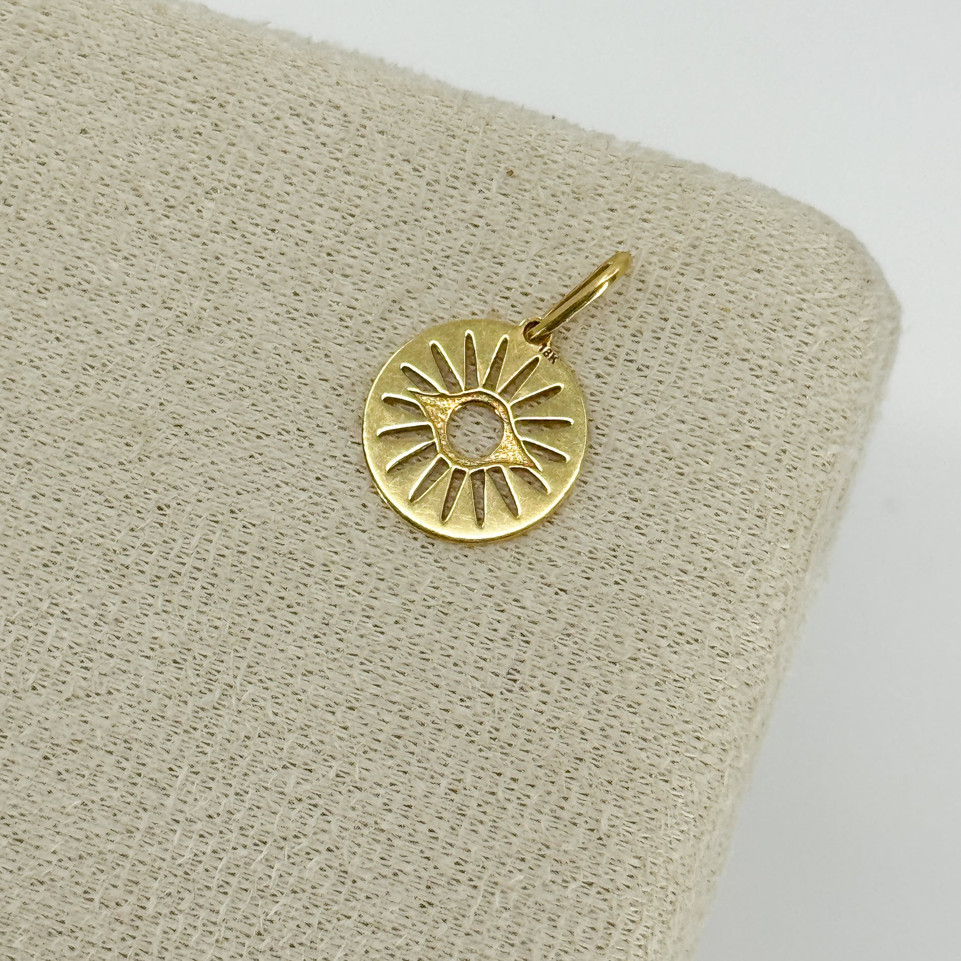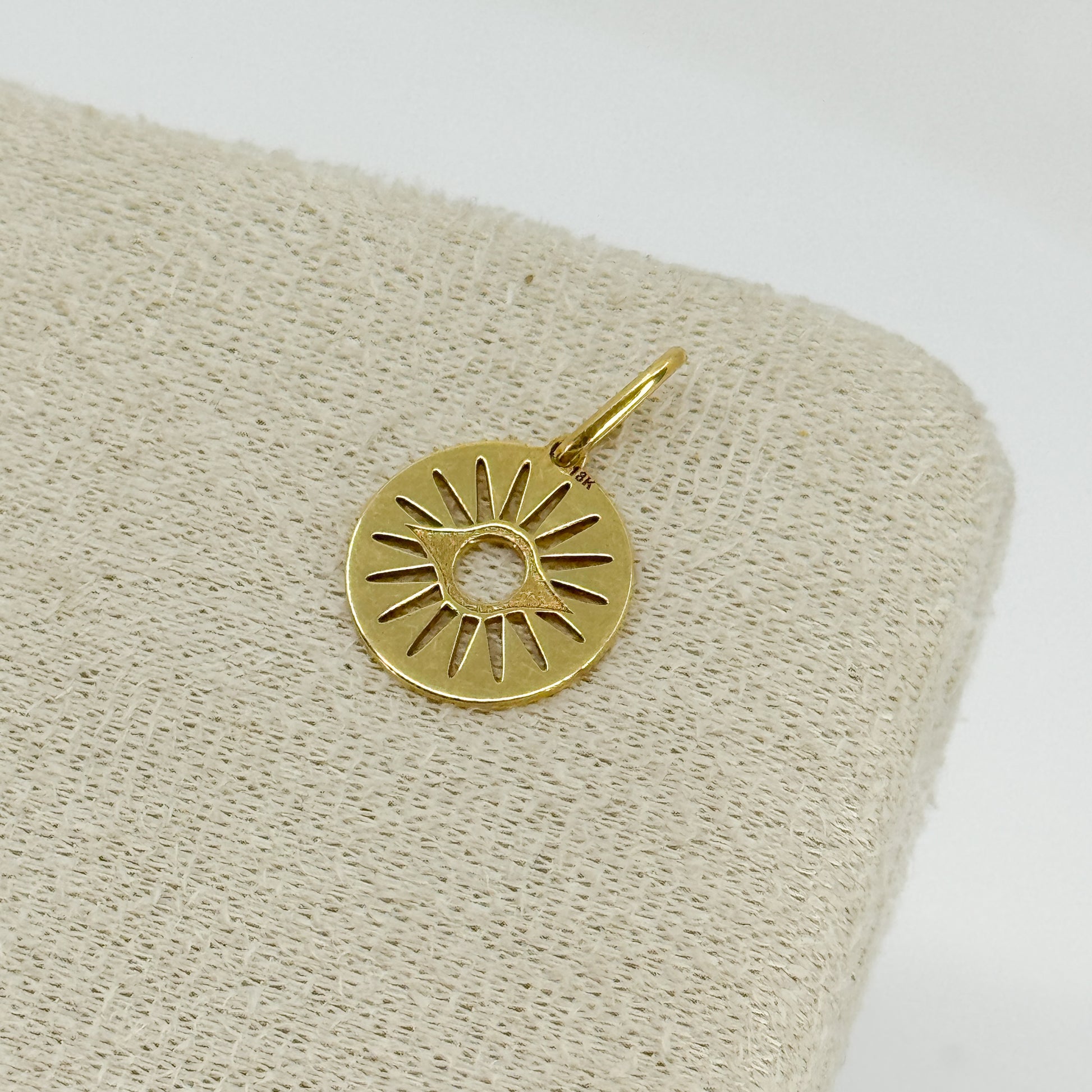 El dije Sol Radiante está elaborado en oro 18k y destaca por su diseño calado en forma de sol, con rayos finos y alargados que aportan un brillo único y elegante. Su acabado satinado y pulido crea un contraste sutil que realza la forma central, evocando luz, energía y vitalidad.