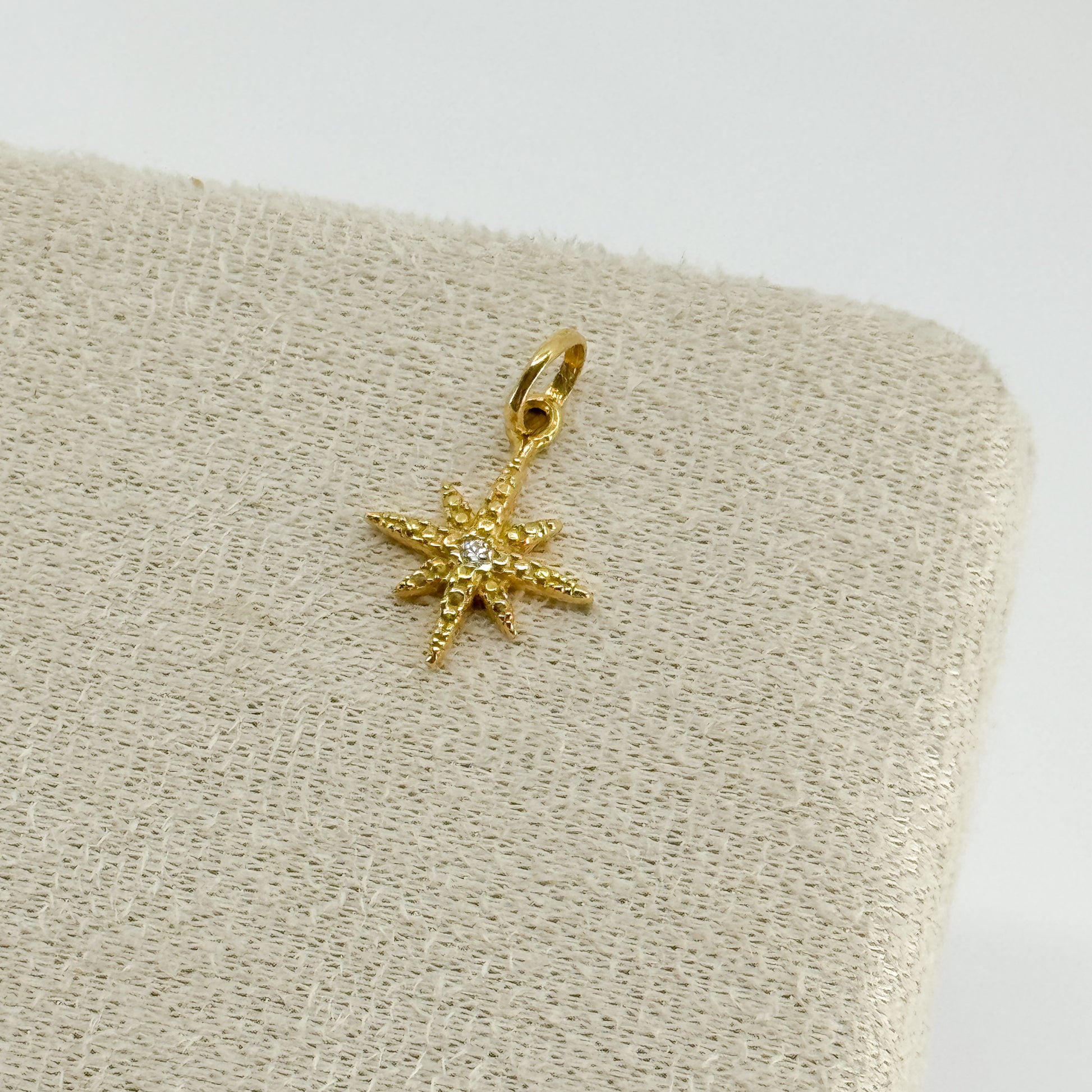 El dije Estrella Polar Brillante está elaborado en oro 18k y destaca por su superficie con puntos en alto relieve que aportan textura, brillo y un efecto luminoso único. En el centro, un circon blanco captura la luz y realza la forma estelar, evocando la guía y claridad de la estrella polar.
