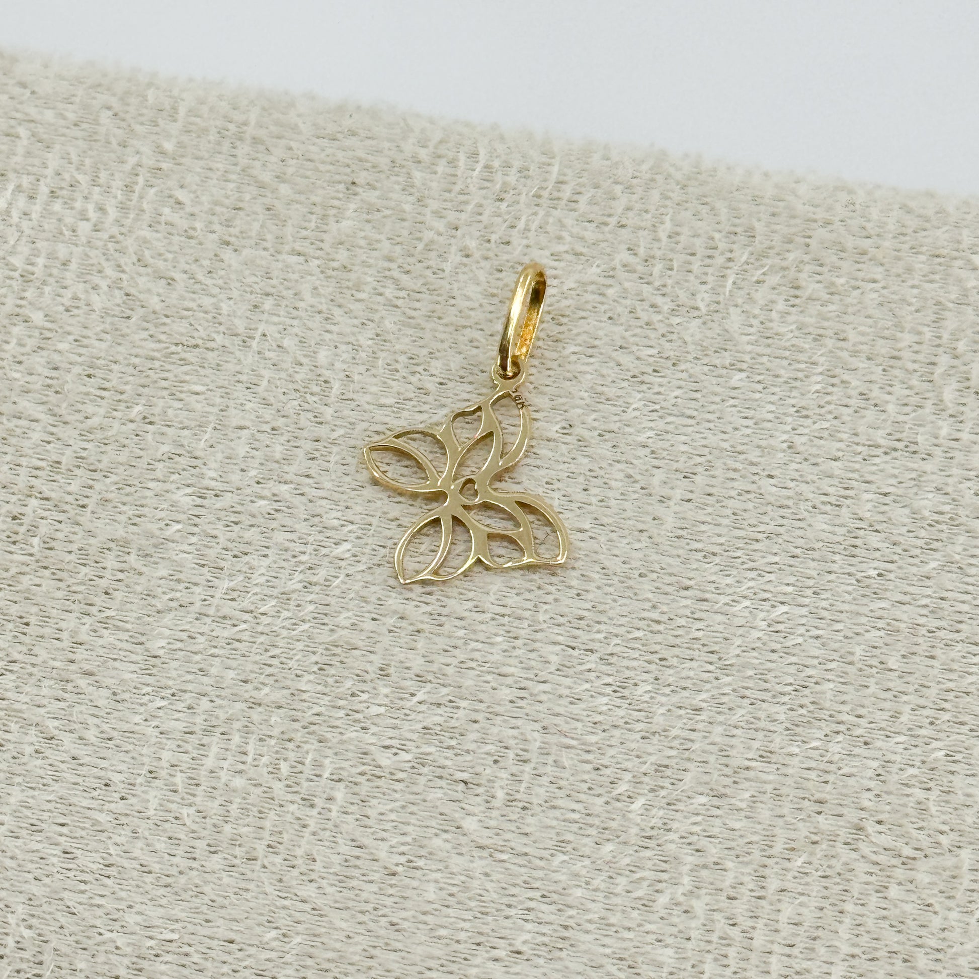 Dije de mariposa calada en oro 18k con efecto colgante que le da movimiento y delicadeza. Una pieza elegante y ligera que simboliza libertad y transformación, perfecta para resaltar tu estilo con sofisticación.