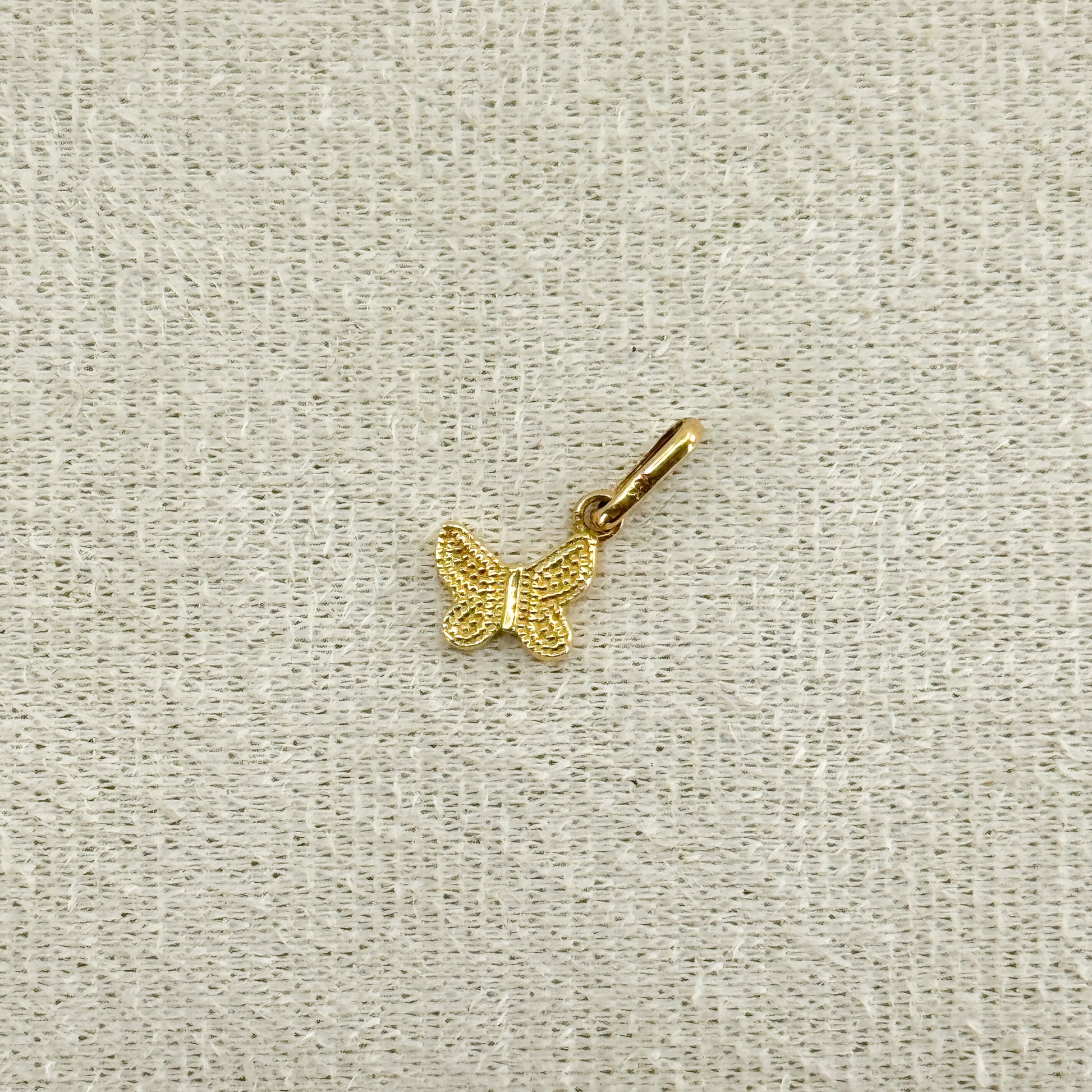 Dije de mariposa masiza en oro 18k, con una cara lisa y la otra con puntos en alto relieve que aportan textura y carácter. Una pieza sofisticada que combina elegancia y diseño creativo, ideal para quienes buscan joyería con personalidad.
