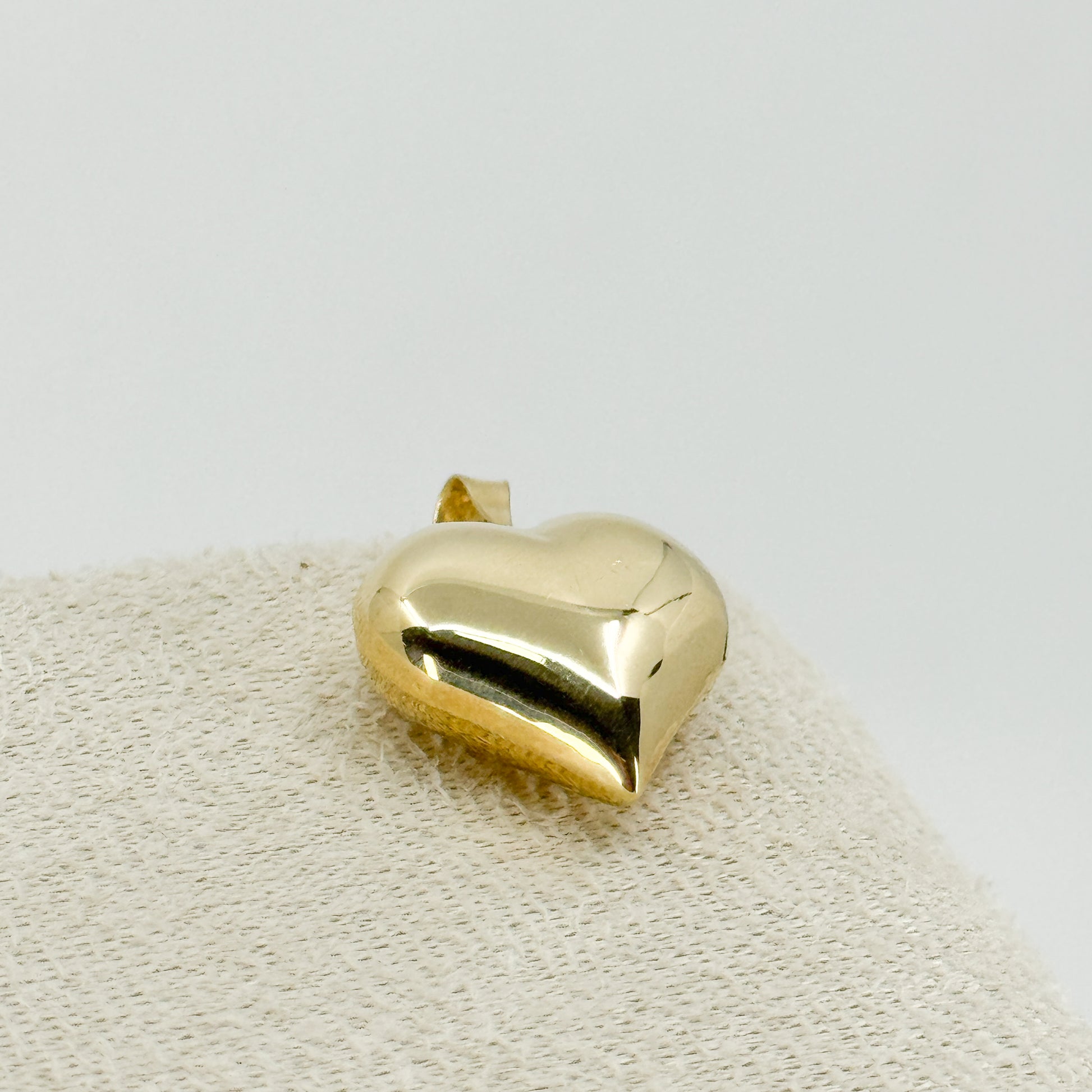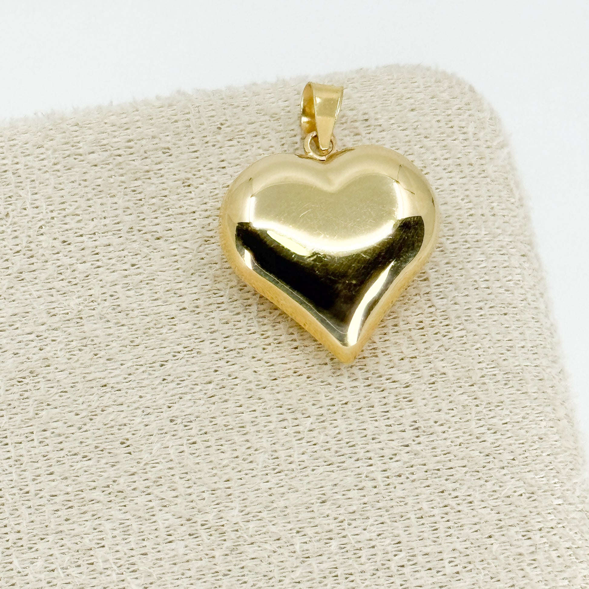El Dije Heart Bombé Grande es una pieza llamativa y sofisticada, elaborada en un corazón de tamaño amplio con acabado bombeado, que le da volumen, suavidad y una presencia elegante. Su superficie totalmente lisa realza el brillo natural del oro, creando un diseño limpio, moderno y atemporal.