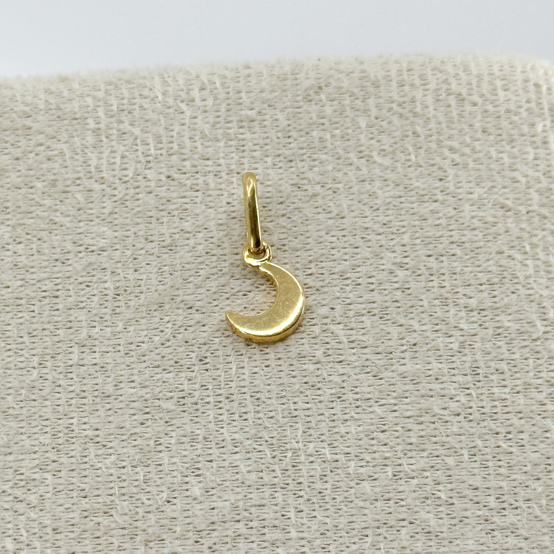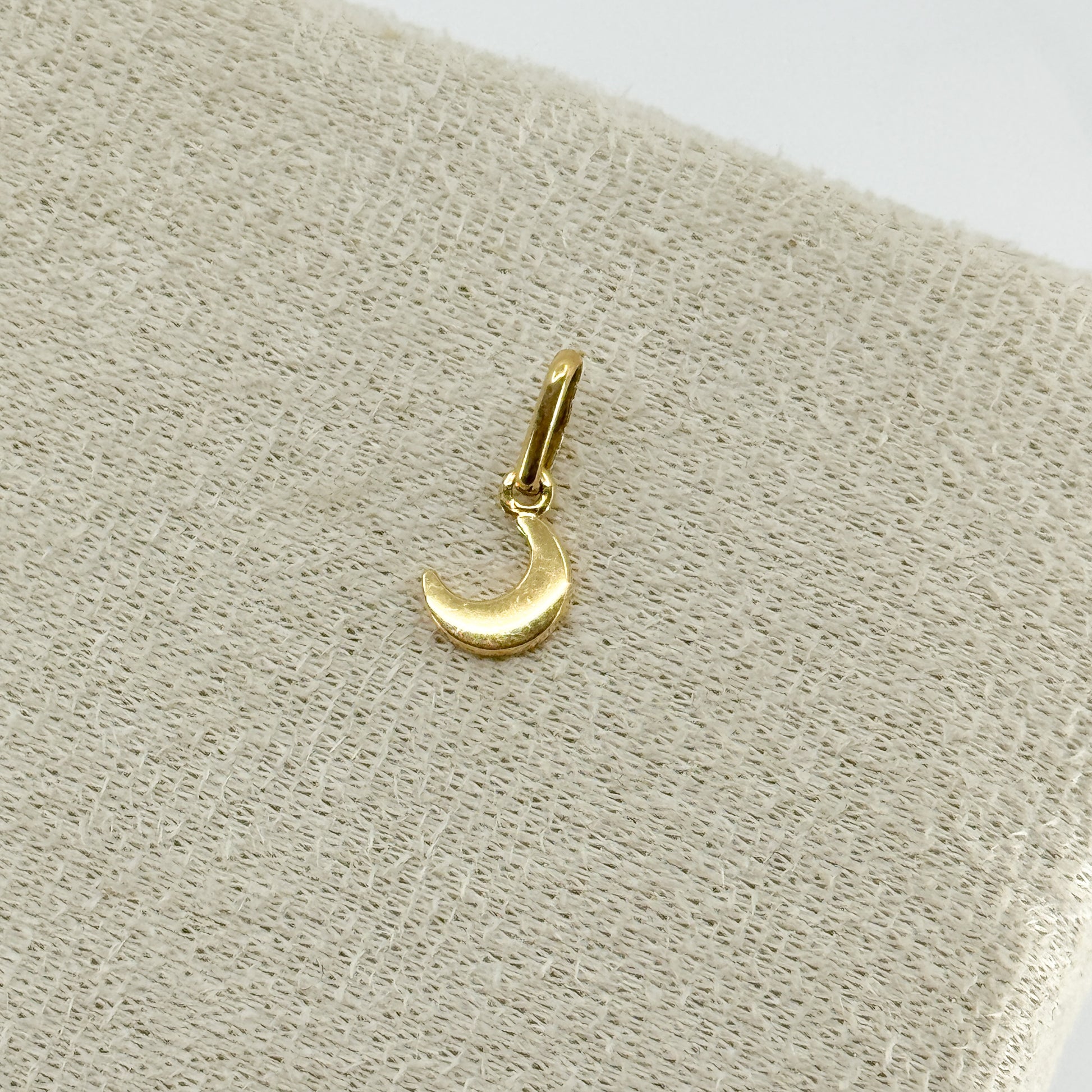 El dije Luna Forestal está elaborado en oro 18k y presenta una placa maciza con un diseño reversible lleno de encanto. Una de sus caras es completamente lisa y pulida, reflejando la luz con un brillo limpio y elegante; mientras que la otra cara exhibe pinitos en alto relieve, creando un paisaje delicado que evoca naturaleza, calma y conexión con la noche.