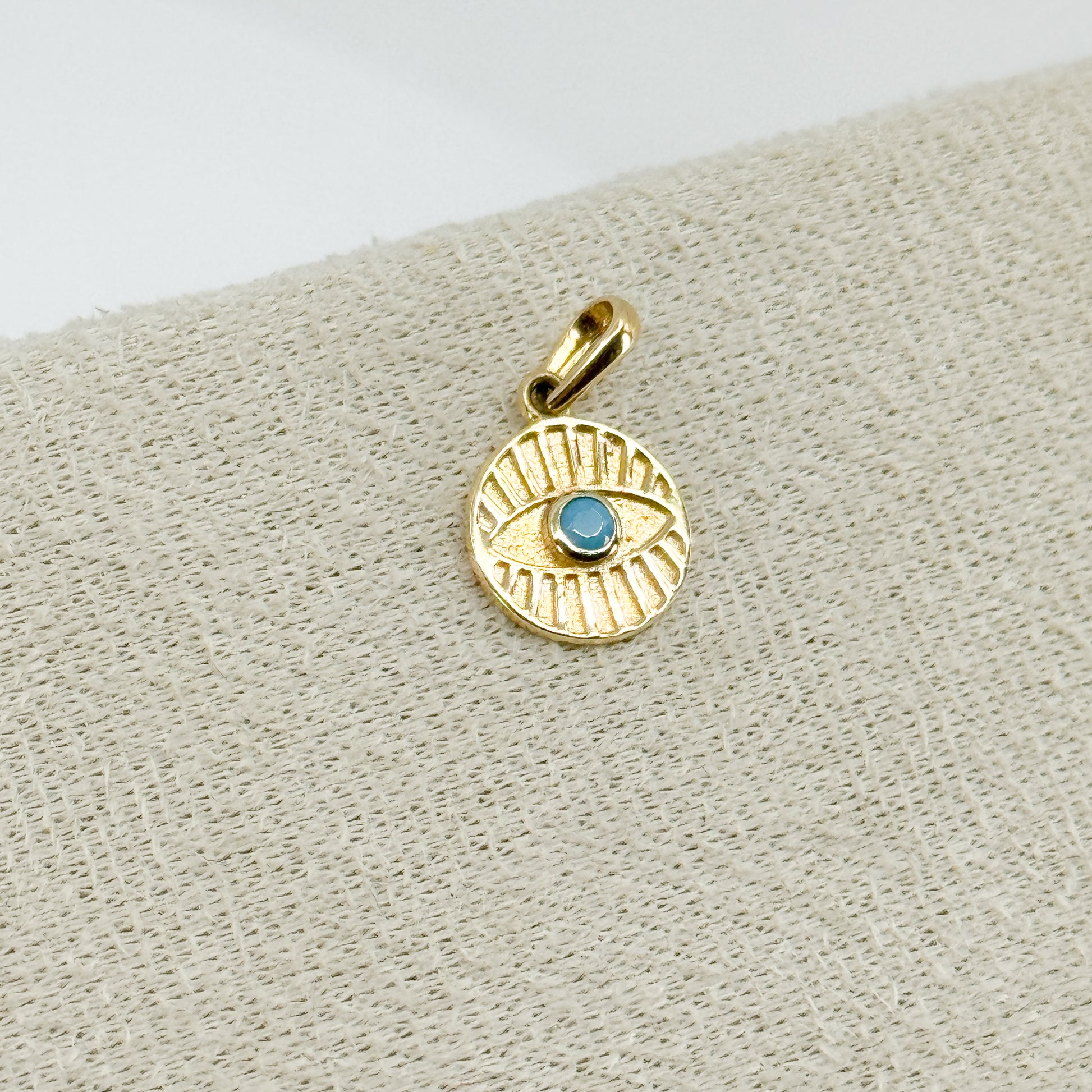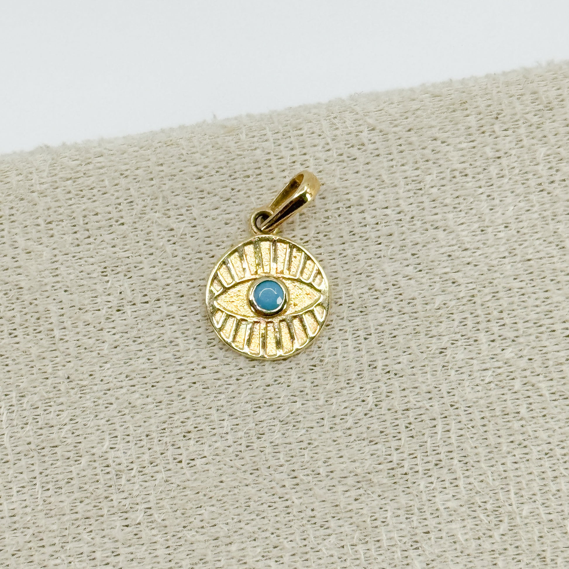 Dije con ojo abierto en el centro, iris de piedra turquesa y pestañas en alto relieve que evocan delicados rayos de sol. Una pieza única que combina protección, energía positiva y estilo sofisticado.