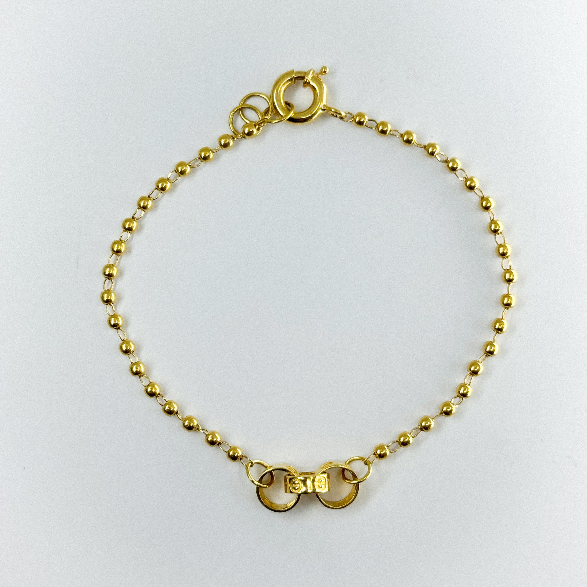 Inspirada en la elegancia clásica, esta pulsera está elaborada en oro de 18 quilates y presenta tres aros entrelazados con el sello grabado, símbolo de unión y armonía. Su diseño se complementa con delicadas esferas enlazadas a lo largo de la pieza y un exclusivo broche tipo timón, que añade un toque de distinción y sofisticación. Una joya atemporal que refleja equilibrio, estilo y lujo en cada detalle.