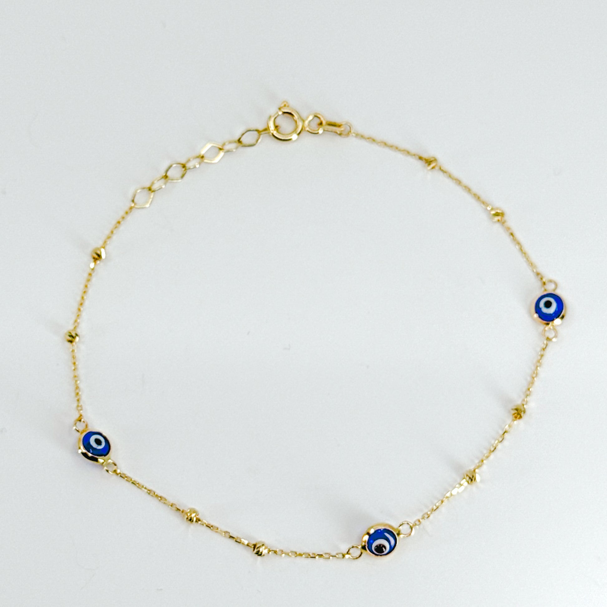 Pulsera elaborada en oro 18k con tres delicados ojitos turcos en tonos azules y bolitas de oro que realzan su brillo natural. Un diseño lleno de significado que combina elegancia y protección, ideal para quienes buscan una joya con estilo y energía positiva. Su contraste entre el azul intenso y el dorado crea una pieza sofisticada, perfecta para usar todos los días o regalar como símbolo de buenos deseos y armonía.