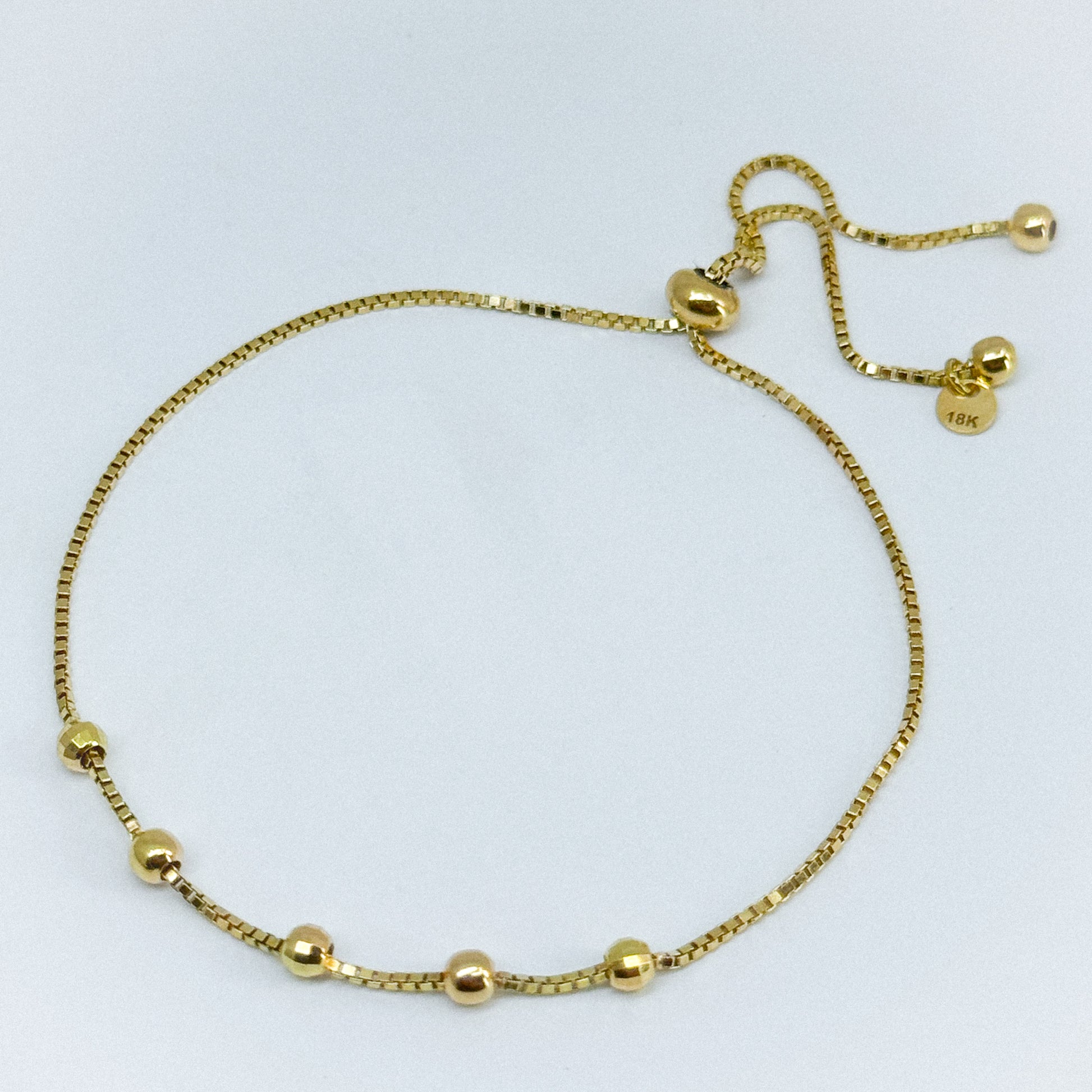 La Pulsera Satélite 18k destaca por su diseño delicado y moderno, compuesto por una fina cadena regulable que sostiene seis esferas de oro 18k distribuidas con armonía. Su estilo simula pequeños satélites orbitando suavemente alrededor de la muñeca, creando un brillo continuo y elegante.